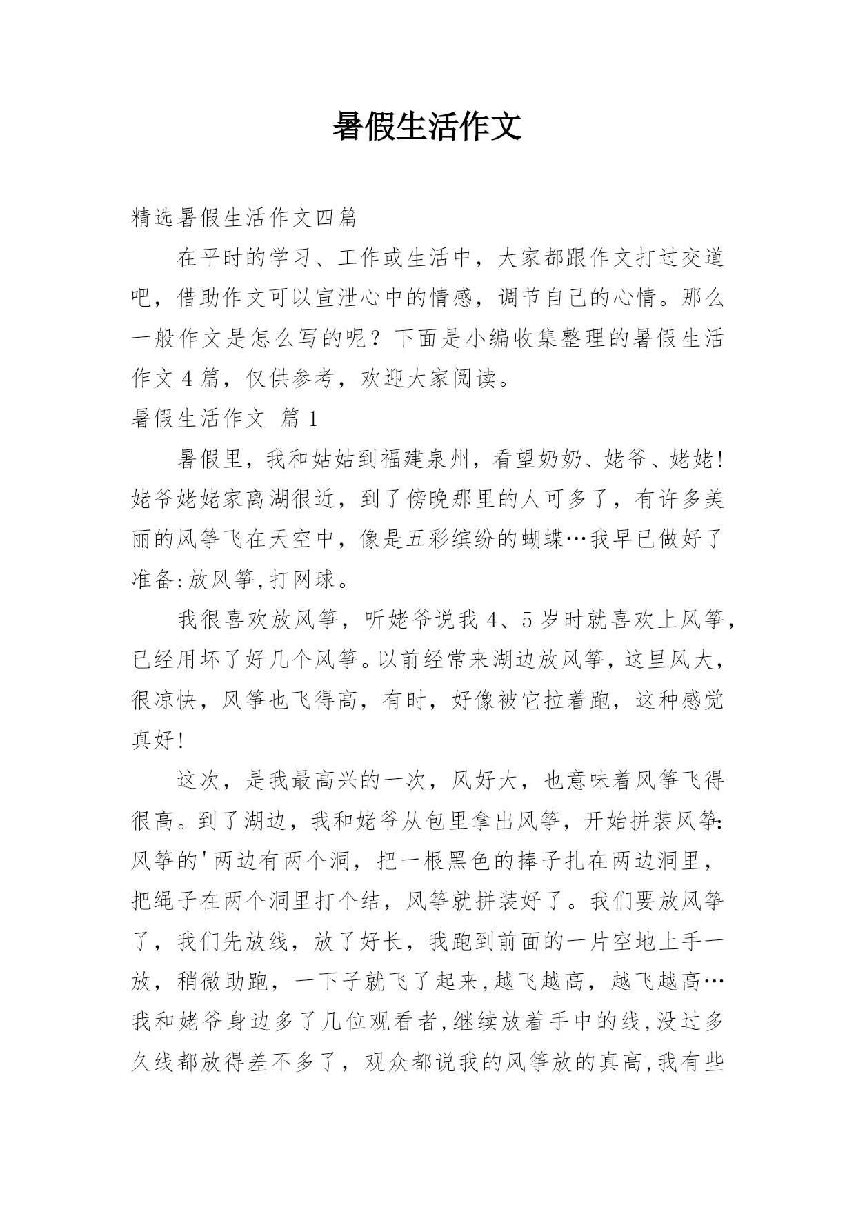 暑假生活作文精选暑假生活作文四篇在平时的学习、工作或生活中,大家都跟作文打过交道吧,借助作文可以宣泄心中的情感,调节自己的心情。那么一般作文是怎么写的呢?下面是小编收集整理的暑假生活作文4篇,仅供参考,欢迎大家阅读。暑假生活作文篇1暑假里,我和姑姑到福建泉州,看望奶奶、姥爷、姥姥!姥爷姥姥家离湖很近,到了傍晚那里的人可多了,有许多美丽的风筝飞在天空中,像是五彩缤纷的蝴蝶…我早已做好了准备:放风筝,打网球。我很喜欢放风筝,听姥爷说我4、5岁时就喜欢上风筝,已经用坏了好几个风筝。以前经常来湖边放风筝,这里风大