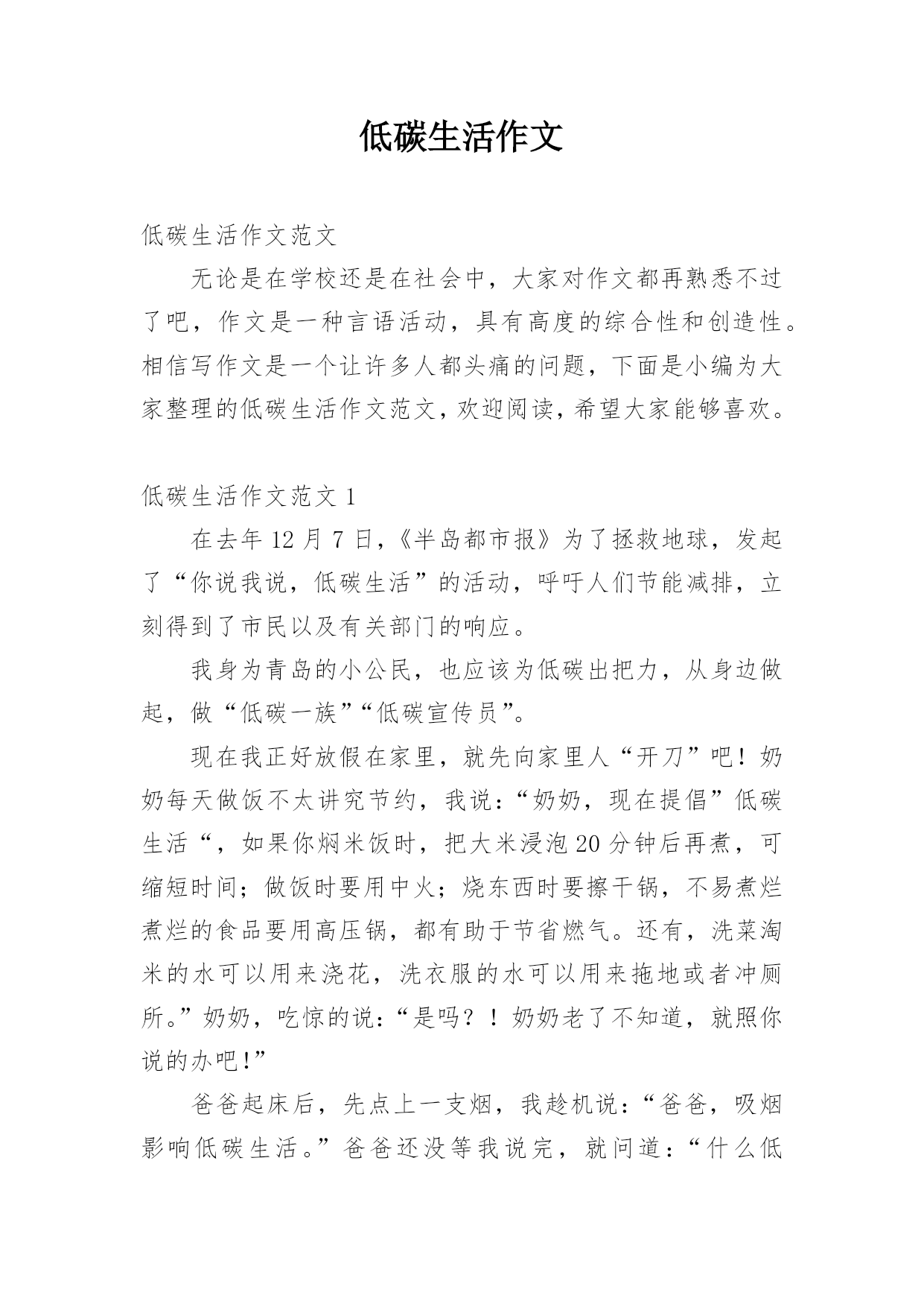 低碳生活作文低碳生活作文范文无论是在学校还是在社会中,大家对作文都再熟悉不过了吧,作文是一种言语活动,具有高度的综合性和创造性。相信写作文是一个让许多人都头痛的问题,下面是小编为大家整理的低碳生活作文范文,欢迎阅读,希望大家能够喜欢。低碳生活作文范文1在去年12月7日,《半岛都市报》为了拯救地球,发起了“你说我说,低碳生活”的活动,呼吁人们节能减排,立刻得到了市民以及有关部门的响应。我身为青岛的小公民,也应该为低碳出把力,从身边做起,做“低碳一族”“低碳宣传员”。现在我正好放假在家里,就先向家里人“开刀”
