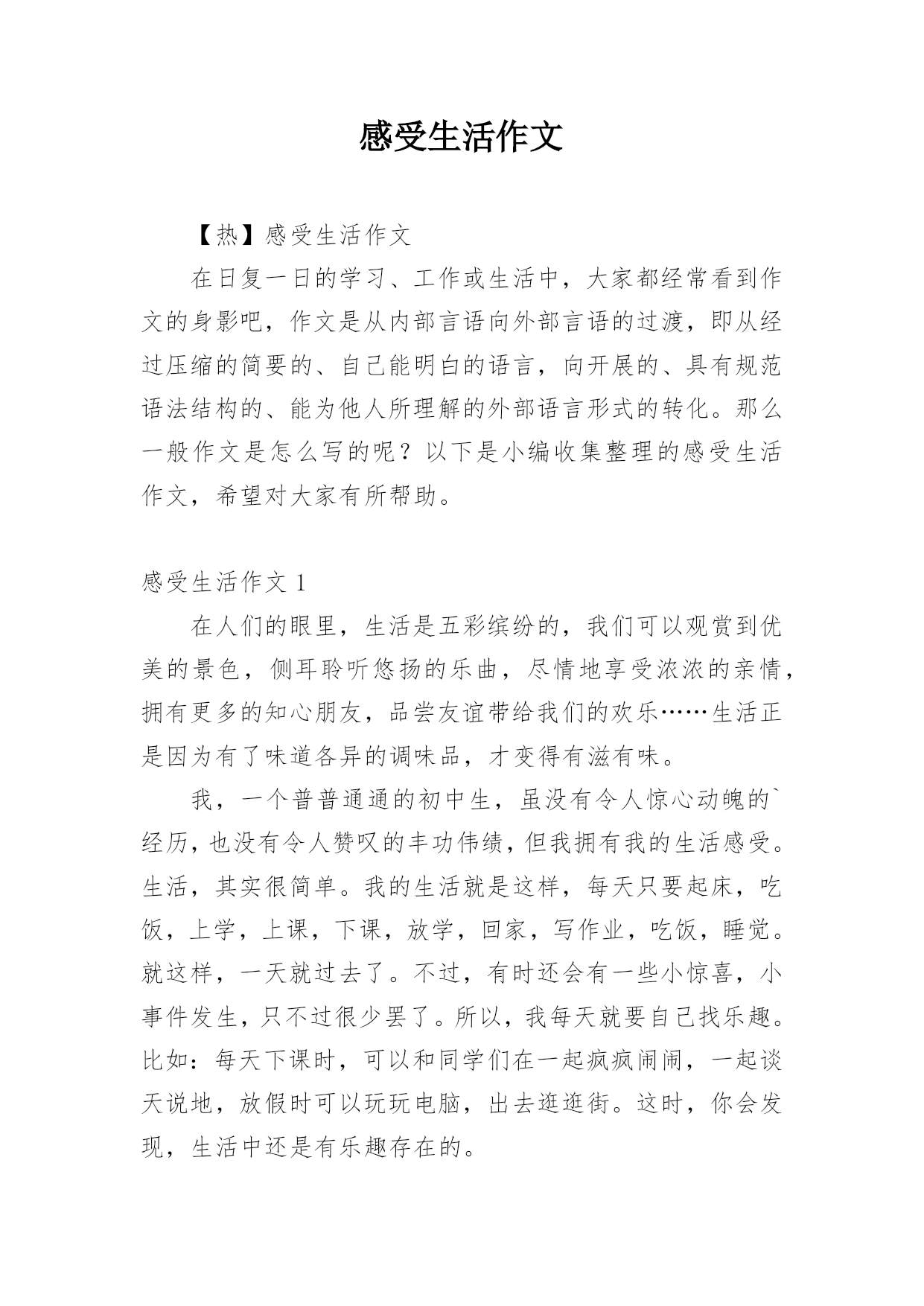 感受生活作文【热】感受生活作文在日复一日的学习、工作或生活中,大家都经常看到作文的身影吧,作文是从内部言语向外部言语的过渡,即从经过压缩的简要的、自己能明白的语言,向开展的、具有规范语法结构的、能为他人所理解的外部语言形式的转化。那么一般作文是怎么写的呢?以下是小编收集整理的感受生活作文,希望对大家有所帮助。感受生活作文1在人们的眼里,生活是五彩缤纷的,我们可以观赏到优美的景色,侧耳聆听悠扬的乐曲,尽情地享受浓浓的亲情,拥有更多的知心朋友,品尝友谊带给我们的欢乐……生活正是因为有了味道各异的调味品,才变得