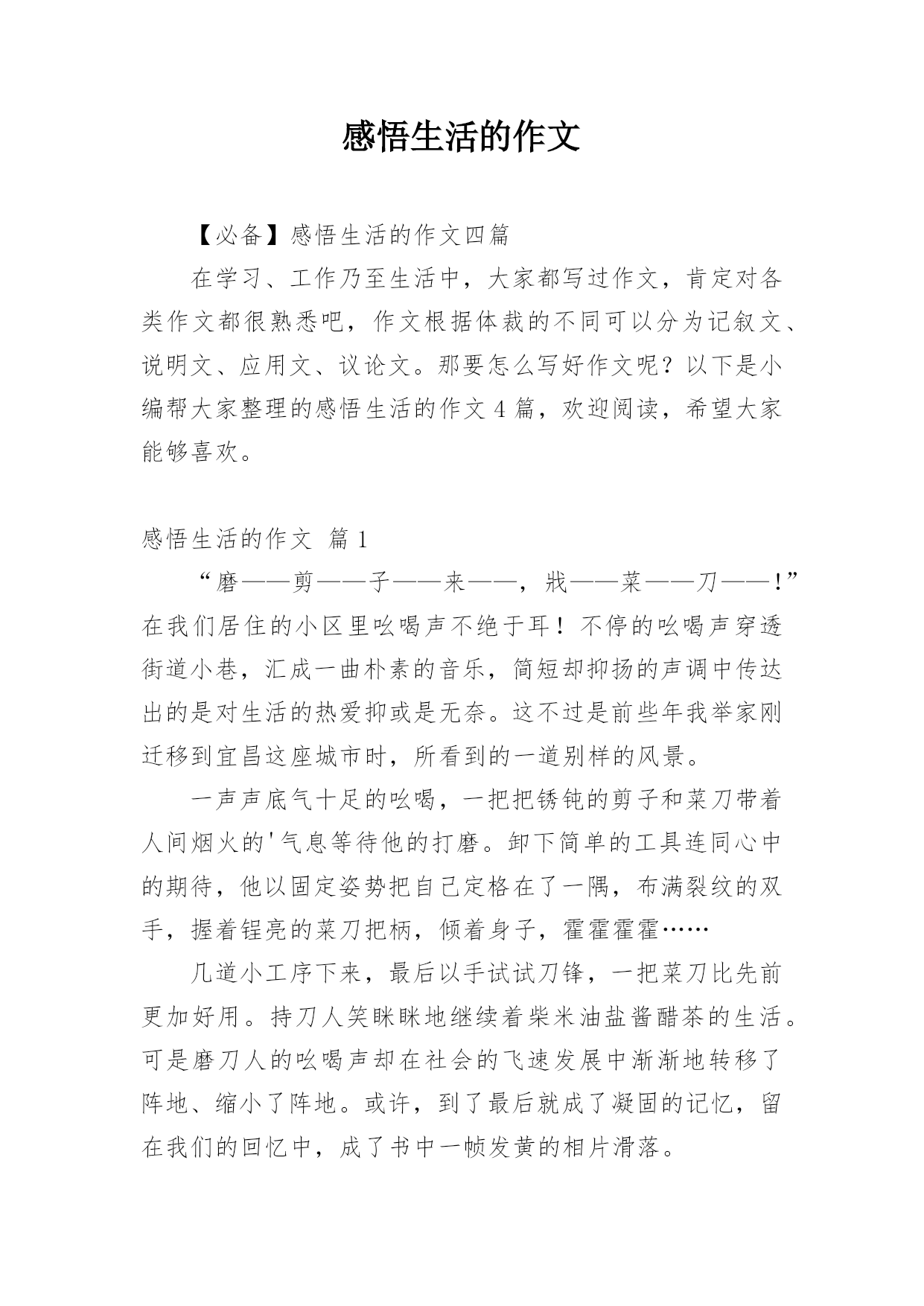 感悟生活的作文【必备】感悟生活的作文四篇在学习、工作乃至生活中,大家都写过作文,肯定对各类作文都很熟悉吧,作文根据体裁的不同可以分为记叙文、说明文、应用文、议论文。那要怎么写好作文呢?以下是小编帮大家整理的感悟生活的作文4篇,欢迎阅读,希望大家能够喜欢。感悟生活的作文篇1“磨——剪——子——来——,戕——菜——刀——!”在我们居住的小区里吆喝声不绝于耳!不停的吆喝声穿透街道小巷,汇成一曲朴素的音乐,简短却抑扬的声调中传达出的是对生活的热爱抑或是无奈。这不过是前些年我举家刚迁移到宜昌这座城市时,所看到的一道