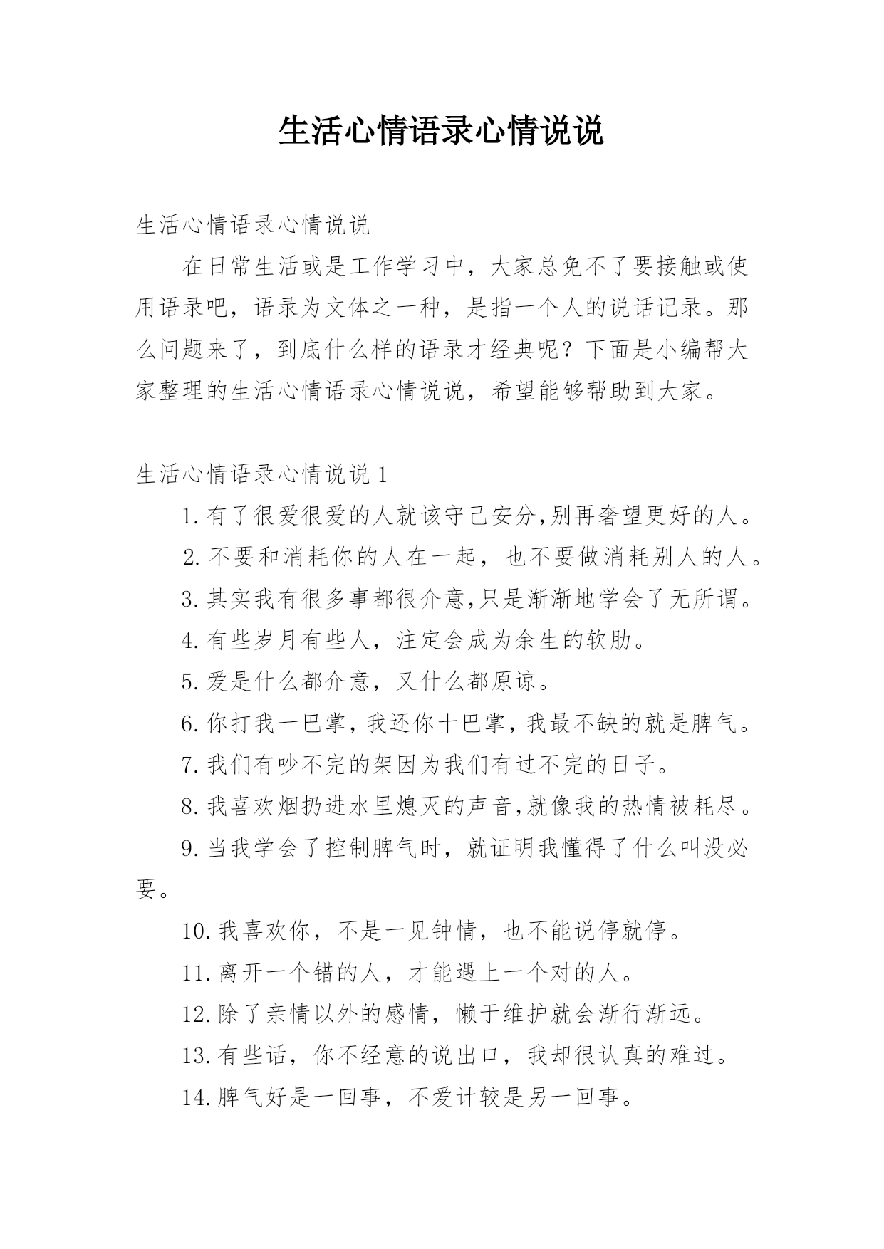 生活心情语录心情说说生活心情语录心情说说在日常生活或是工作学习中,大家总免不了要接触或使用语录吧,语录为文体之一种,是指一个人的说话记录。那么问题来了,到底什么样的语录才经典呢?下面是小编帮大家整理的生活心情语录心情说说,希望能够帮助到大家。生活心情语录心情说说11.有了很爱很爱的人就该守己安分,别再奢望更好的人。2.不要和消耗你的人在一起,也不要做消耗别人的人。3.其实我有很多事都很介意,只是渐渐地学会了无所谓。4.有些岁月有些人,注定会成为余生的软肋。5.爱是什么都介意,又什么都原谅。6.你打我一巴掌