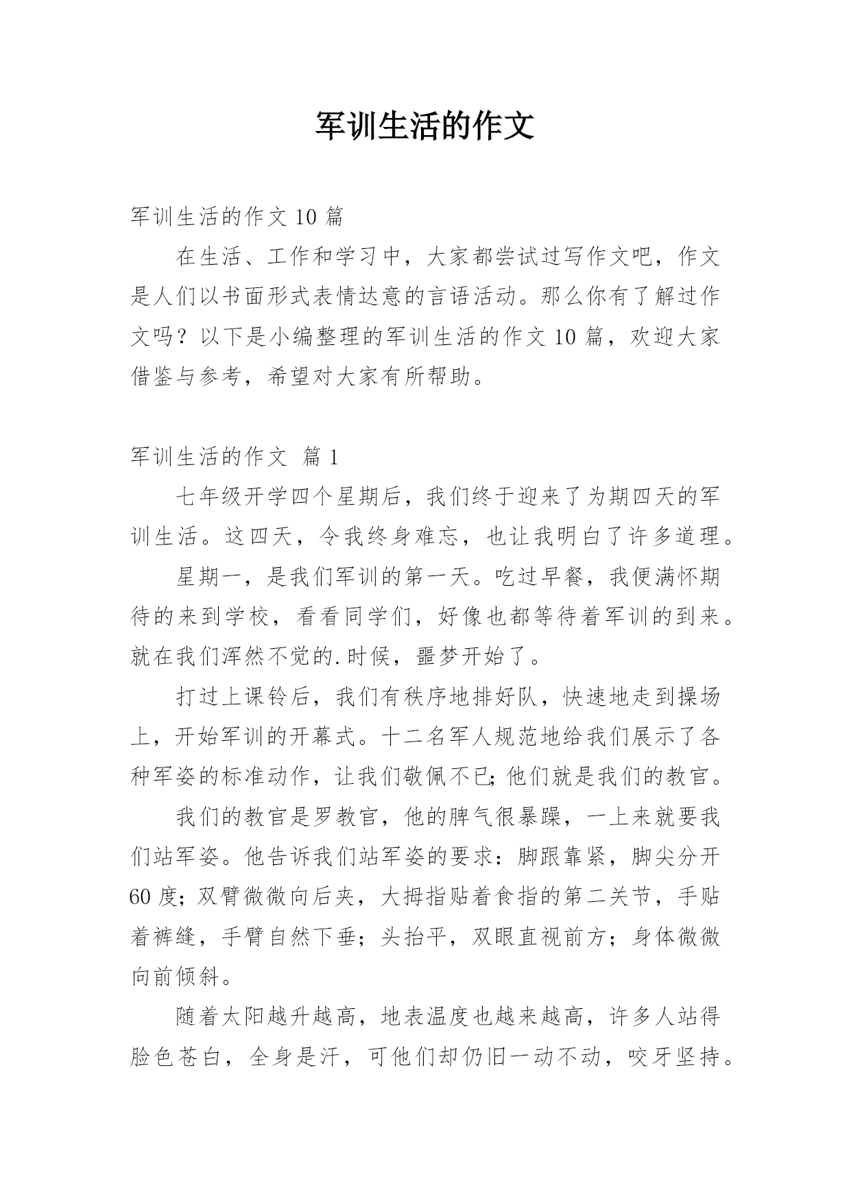 军训生活的作文军训生活的作文10篇在生活、工作和学习中,大家都尝试过写作文吧,作文是人们以书面形式表情达意的言语活动。那么你有了解过作文吗?以下是小编整理的军训生活的作文10篇,欢迎大家借鉴与参考,希望对大家有所帮助。军训生活的作文篇1七年级开学四个星期后,我们终于迎来了为期四天的军训生活。这四天,令我终身难忘,也让我明白了许多道理。星期一,是我们军训的第一天。吃过早餐,我便满怀期待的来到学校,看看同学们,好像也都等待着军训的到来。就在我们浑然不觉的.时候,噩梦开始了。打过上课铃后,我们有秩序地排好队,快