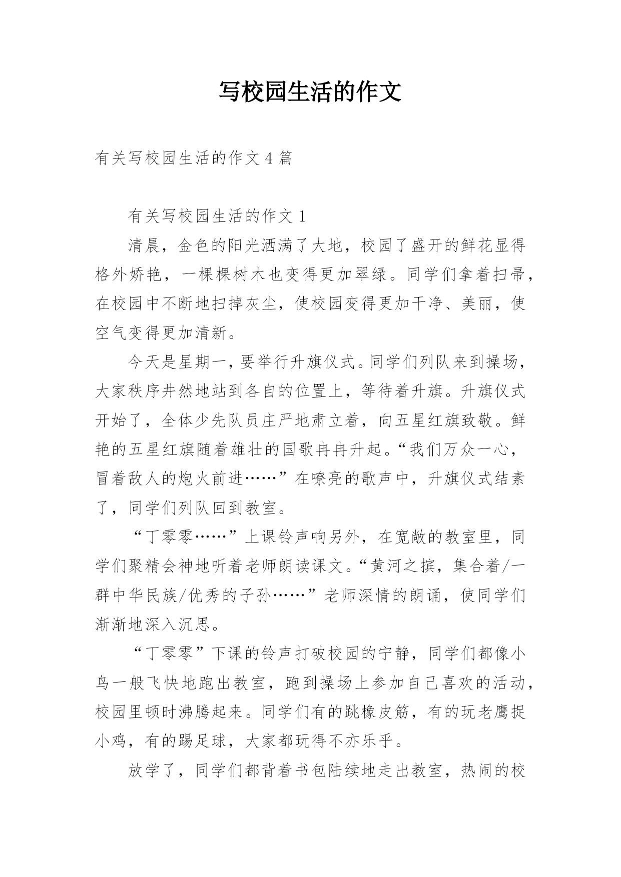 写校园生活的作文有关写校园生活的作文4篇有关写校园生活的作文1清晨,金色的阳光洒满了大地,校园了盛开的鲜花显得格外娇艳,一棵棵树木也变得更加翠绿。同学们拿着扫帚,在校园中不断地扫掉灰尘,使校园变得更加干净、美丽,使空气变得更加清新。今天是星期一,要举行升旗仪式。同学们列队来到操场,大家秩序井然地站到各自的位置上,等待着升旗。升旗仪式开始了,全体少先队员庄严地肃立着,向五星红旗致敬。鲜艳的五星红旗随着雄壮的国歌冉冉升起。“我们万众一心,冒着敌人的炮火前进……”在嘹亮的歌声中,升旗仪式结素了,同学们列队回到教