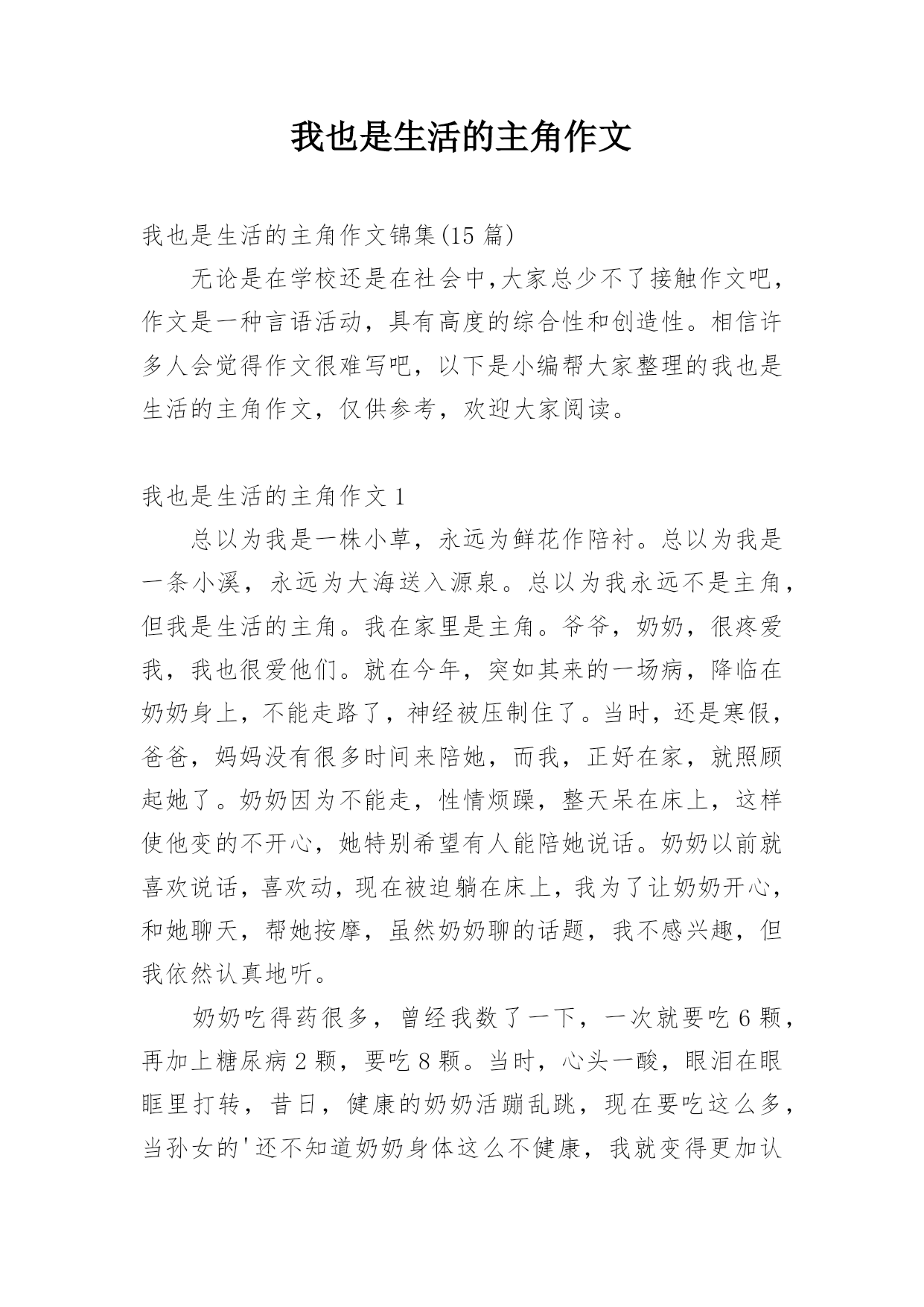 我也是生活的主角作文我也是生活的主角作文锦集(15篇)无论是在学校还是在社会中,大家总少不了接触作文吧,作文是一种言语活动,具有高度的综合性和创造性。相信许多人会觉得作文很难写吧,以下是小编帮大家整理的我也是生活的主角作文,仅供参考,欢迎大家阅读。我也是生活的主角作文1总以为我是一株小草,永远为鲜花作陪衬。总以为我是一条小溪,永远为大海送入源泉。总以为我永远不是主角,但我是生活的主角。我在家里是主角。爷爷,奶奶,很疼爱我,我也很爱他们。就在今年,突如其来的一场病,降临在奶奶身上,不能走路了,神经被压制住了