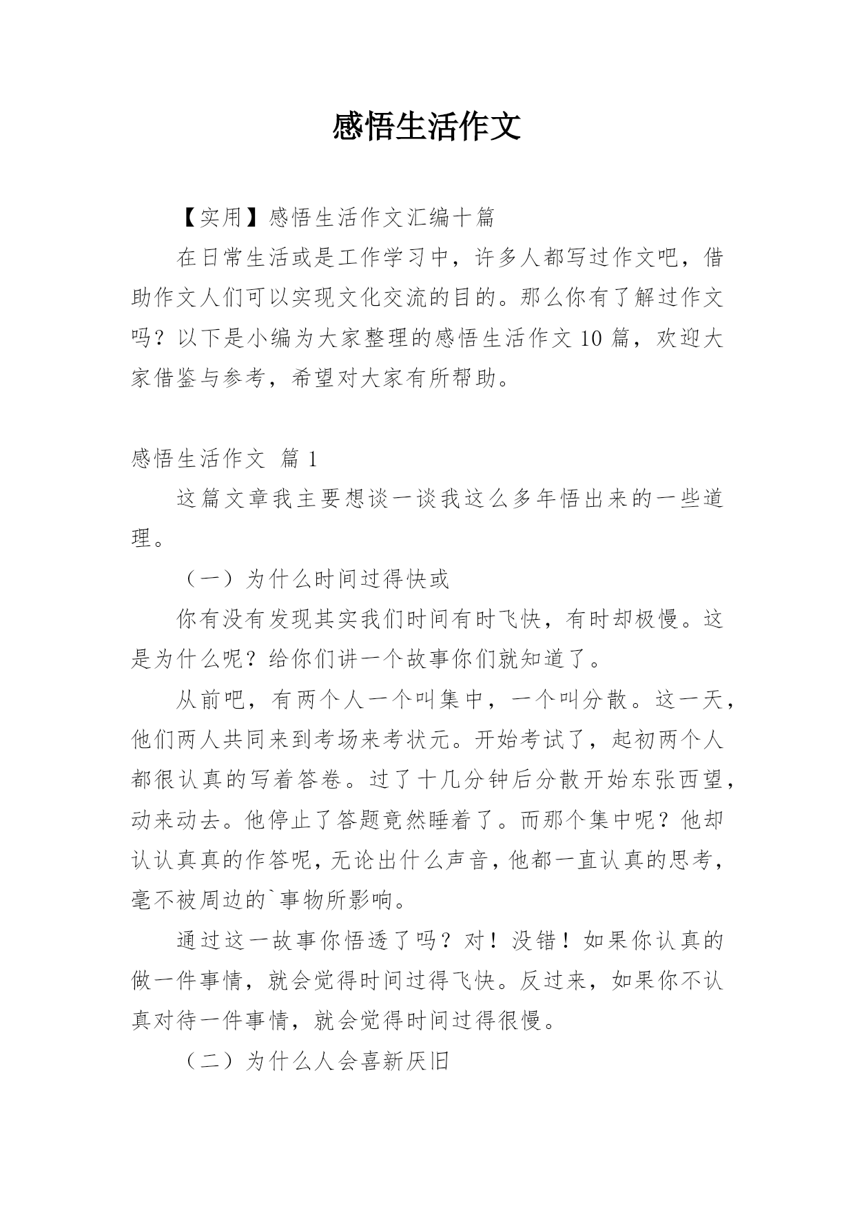 感悟生活作文【实用】感悟生活作文汇编十篇在日常生活或是工作学习中,许多人都写过作文吧,借助作文人们可以实现文化交流的目的。那么你有了解过作文吗?以下是小编为大家整理的感悟生活作文10篇,欢迎大家借鉴与参考,希望对大家有所帮助。感悟生活作文篇1这篇文章我主要想谈一谈我这么多年悟出来的一些道理。(一)为什么时间过得快或你有没有发现其实我们时间有时飞快,有时却极慢。这是为什么呢?给你们讲一个故事你们就知道了。从前吧,有两个人一个叫集中,一个叫分散。这一天,他们两人共同来到考场来考状元。开始考试了,起初两个人都很