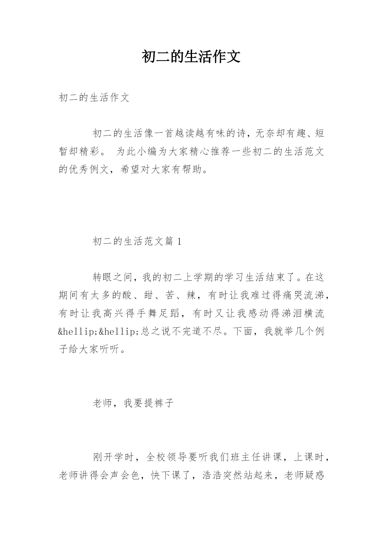 初二的生活作文初二的生活作文初二的生活像一首越读越有味的诗,无奈却有趣、短暂却精彩。为此小编为大家精心推荐一些初二的生活范文的优秀例文,希望对大家有帮助。初二的生活范文篇1转眼之间,我的初二上学期的学习生活结束了。在这期间有太多的酸、甜、苦、辣,有时让我难过得痛哭流涕,有时让我高兴得手舞足蹈,有时又让我感动得涕泪横流……总之说不完道不尽。下面,我就举几个例子给大家听听。老师,我要提裤子刚开学时,全校领导要听我们班主任讲课,上课时,老师讲得会声会色,快下课了,浩浩突然站起来,老师