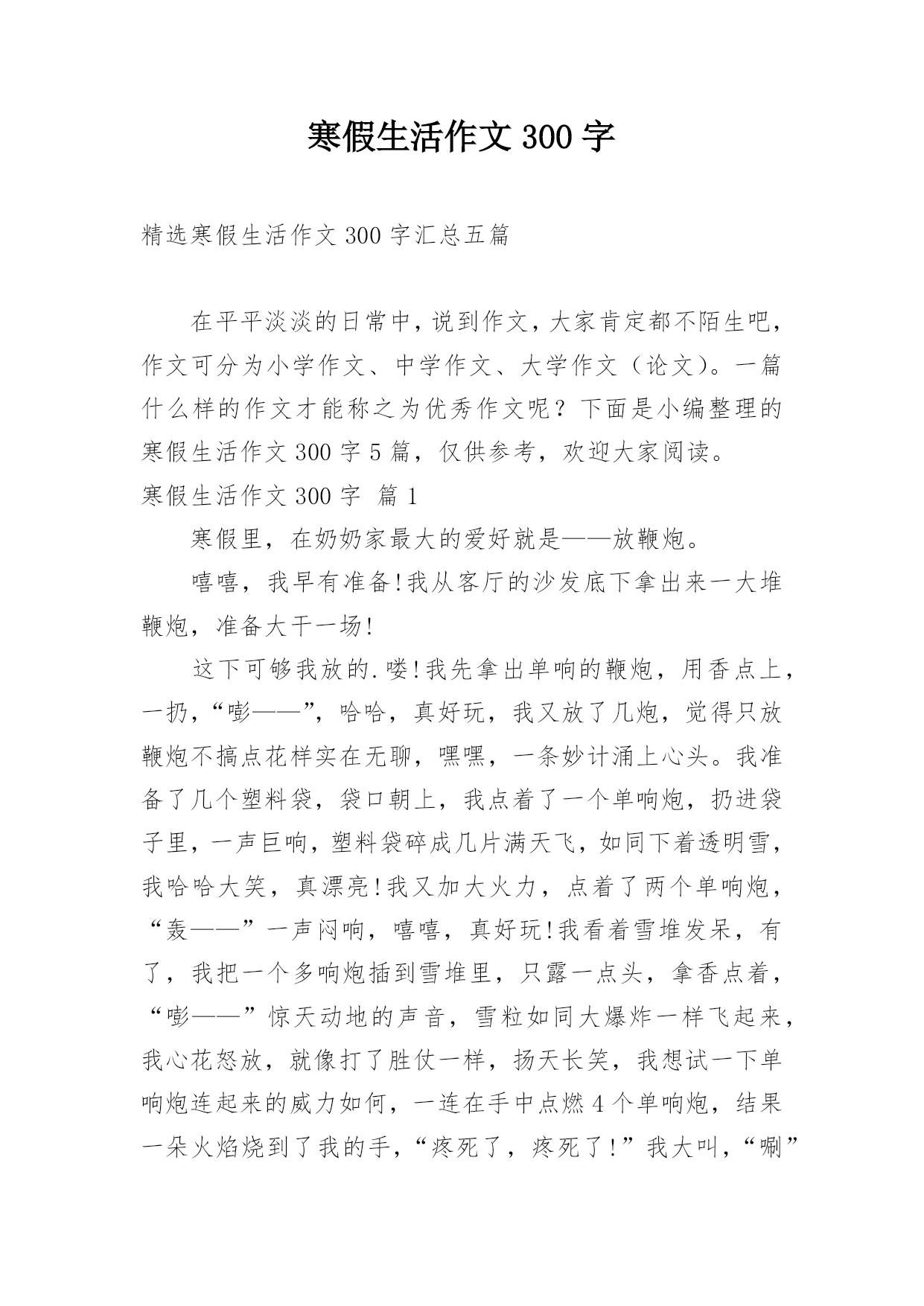 寒假生活作文300字精选寒假生活作文300字汇总五篇在平平淡淡的日常中,说到作文,大家肯定都不陌生吧,作文可分为小学作文、中学作文、大学作文(论文)。一篇什么样的作文才能称之为优秀作文呢?下面是小编整理的寒假生活作文300字5篇,仅供参考,欢迎大家阅读。寒假生活作文300字篇1寒假里,在奶奶家最大的爱好就是——放鞭炮。嘻嘻,我早有准备!我从客厅的沙发底下拿出来一大堆鞭炮,准备大干一场!这下可够我放的.喽!我先拿出单响的鞭炮,用香点上,一扔,“嘭——”,哈哈,真好玩,我又放了几炮,觉得只放鞭炮不搞点花样实在