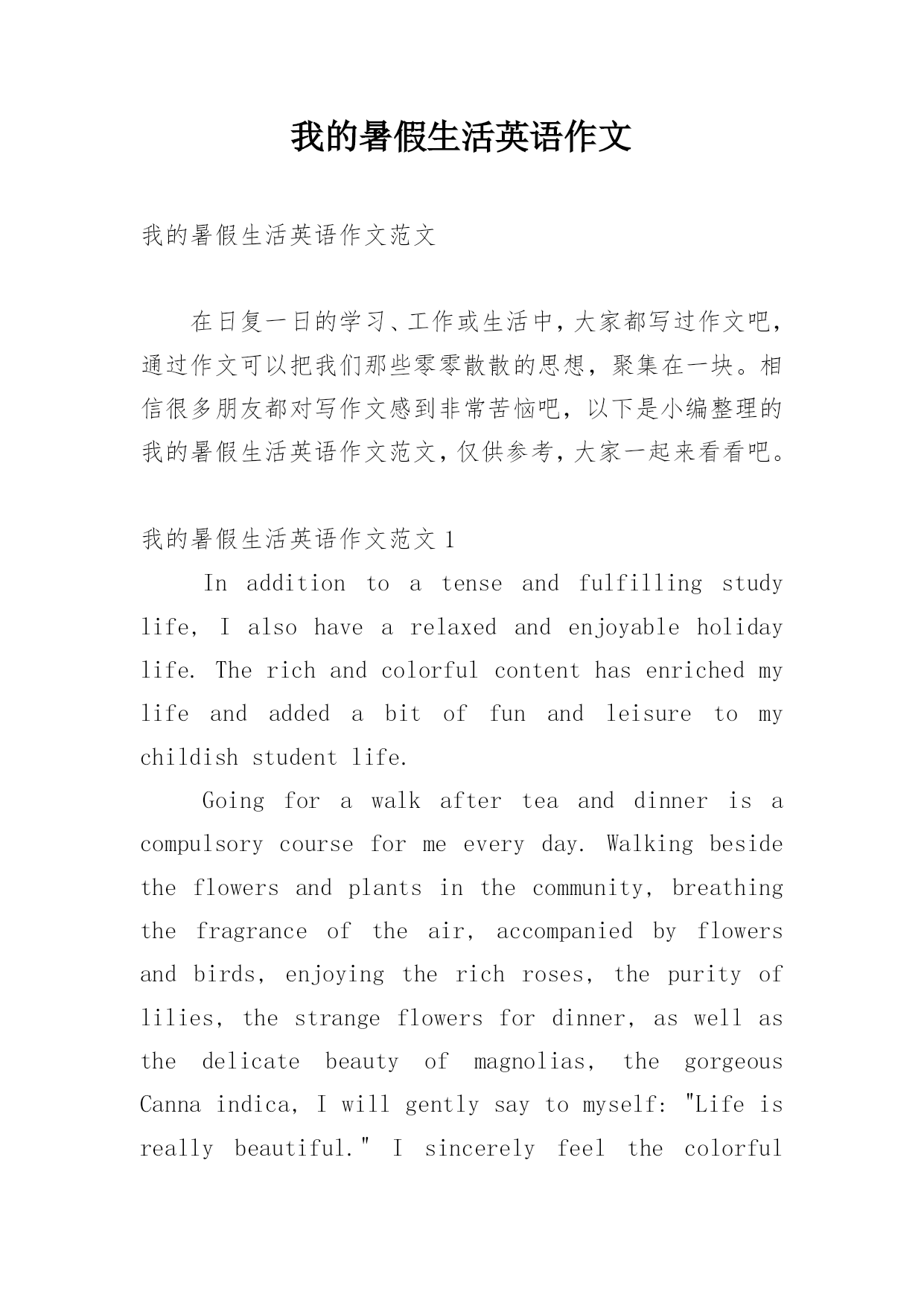 我的暑假生活英语作文我的暑假生活英语作文范文在日复一日的学习、工作或生活中,大家都写过作文吧,通过作文可以把我们那些零零散散的思想,聚集在一块。相信很多朋友都对写作文感到非常苦恼吧,以下是小编整理的我的暑假生活英语作文范文,仅供参考,大家一起来看看吧。我的暑假生活英语作文范文1Inadditiontoatenseandfulfillingstudylife,Ialsohavearelaxedandenjoyableholidaylife.Therichandcolorfulcontenthasenrich