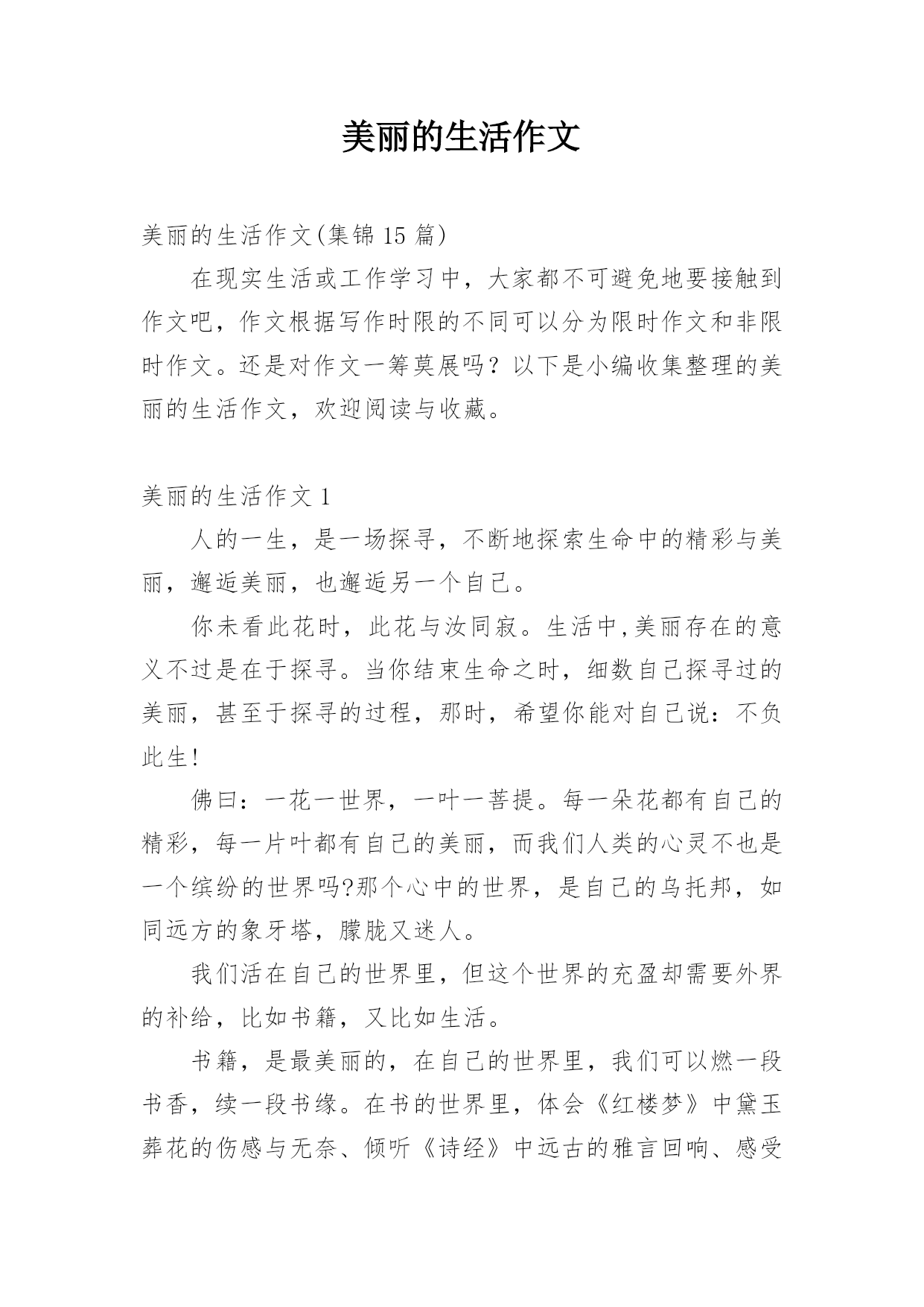 美丽的生活作文美丽的生活作文(集锦15篇)在现实生活或工作学习中,大家都不可避免地要接触到作文吧,作文根据写作时限的不同可以分为限时作文和非限时作文。还是对作文一筹莫展吗?以下是小编收集整理的美丽的生活作文,欢迎阅读与收藏。美丽的生活作文1人的一生,是一场探寻,不断地探索生命中的精彩与美丽,邂逅美丽,也邂逅另一个自己。你未看此花时,此花与汝同寂。生活中,美丽存在的意义不过是在于探寻。当你结束生命之时,细数自己探寻过的美丽,甚至于探寻的过程,那时,希望你能对自己说:不负此生!佛曰:一花一世界,一叶一菩提。每