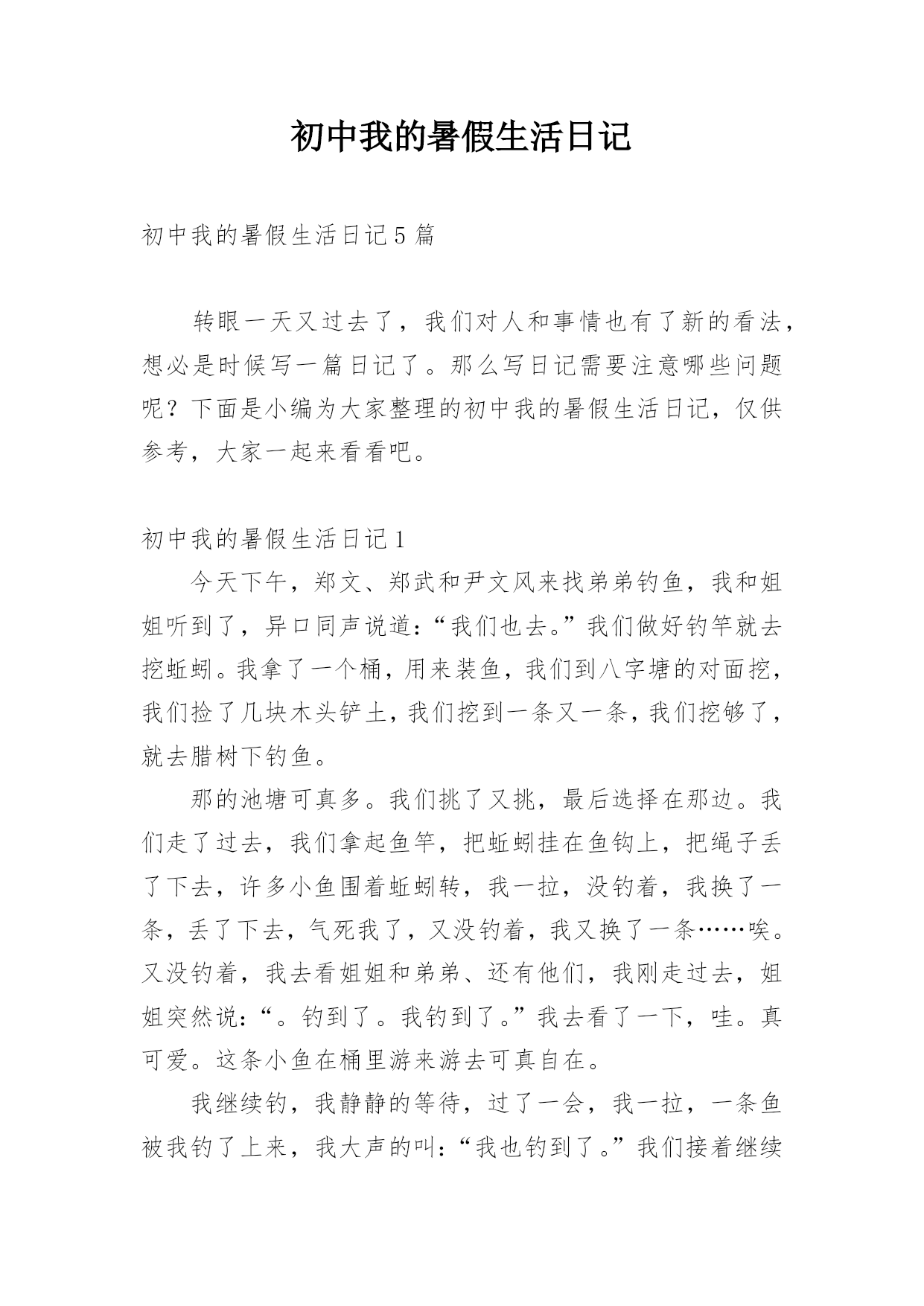 初中我的暑假生活日记初中我的暑假生活日记5篇转眼一天又过去了,我们对人和事情也有了新的看法,想必是时候写一篇日记了。那么写日记需要注意哪些问题呢?下面是小编为大家整理的初中我的暑假生活日记,仅供参考,大家一起来看看吧。初中我的暑假生活日记1今天下午,郑文、郑武和尹文风来找弟弟钓鱼,我和姐姐听到了,异口同声说道:“我们也去。”我们做好钓竿就去挖蚯蚓。我拿了一个桶,用来装鱼,我们到八字塘的对面挖,我们捡了几块木头铲土,我们挖到一条又一条,我们挖够了,就去腊树下钓鱼。那的池塘可真多。我们挑了又挑,最后选择在那边