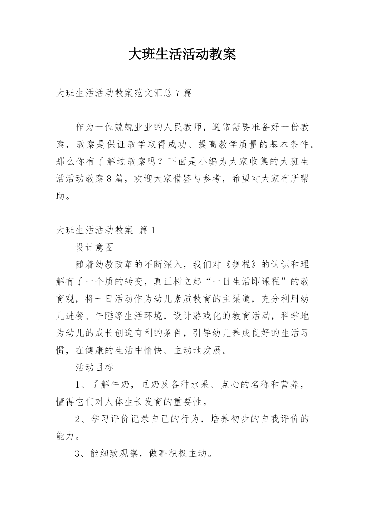 大班生活活动教案大班生活活动教案范文汇总7篇作为一位兢兢业业的人民教师,通常需要准备好一份教案,教案是保证教学取得成功、提高教学质量的基本条件。那么你有了解过教案吗?下面是小编为大家收集的大班生活活动教案8篇,欢迎大家借鉴与参考,希望对大家有所帮助。大班生活活动教案篇1设计意图随着幼教改革的不断深入,我们对《规程》的认识和理解有了一个质的转变,真正树立起“一日生活即课程”的教育观,将一日活动作为幼儿素质教育的主渠道,充分利用幼儿进餐、午睡等生活环境,设计游戏化的教育活动,科学地为幼儿的成长创造有利的条件,