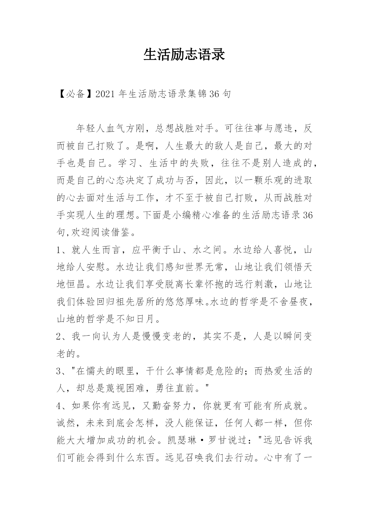 生活励志语录【必备】2021年生活励志语录集锦36句年轻人血气方刚,总想战胜对手。可往往事与愿违,反而被自己打败了。是啊,人生最大的敌人是自己,最大的对手也是自己。学习、生活中的失败,往往不是别人造成的,而是自己的心态决定了成功与否,因此,以一颗乐观的进取的心去面对生活与工作,才不至于被自己打败,从而战胜对手实现人生的理想。下面是小编精心准备的生活励志语录36句,欢迎阅读借鉴。1、就人生而言,应平衡于山、水之间。水边给人喜悦,山地给人安慰。水边让我们感知世界无常,山地让我们领悟天地恒昌。水边让我们享受脱离