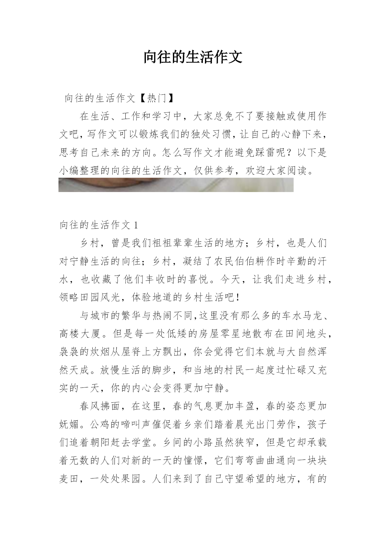 向往的生活作文向往的生活作文【热门】在生活、工作和学习中,大家总免不了要接触或使用作文吧,写作文可以锻炼我们的独处习惯,让自己的心静下来,思考自己未来的方向。怎么写作文才能避免踩雷呢?以下是小编整理的向往的生活作文,仅供参考,欢迎大家阅读。向往的生活作文1乡村,曾是我们祖祖辈辈生活的地方;乡村,也是人们对宁静生活的向往;乡村,凝结了农民伯伯耕作时辛勤的汗水,也收藏了他们丰收时的喜悦。今天,让我们走进乡村,领略田园风光,体验地道的乡村生活吧!与城市的繁华与热闹不同,这里没有那么多的车水马龙、高楼大厦。但是每