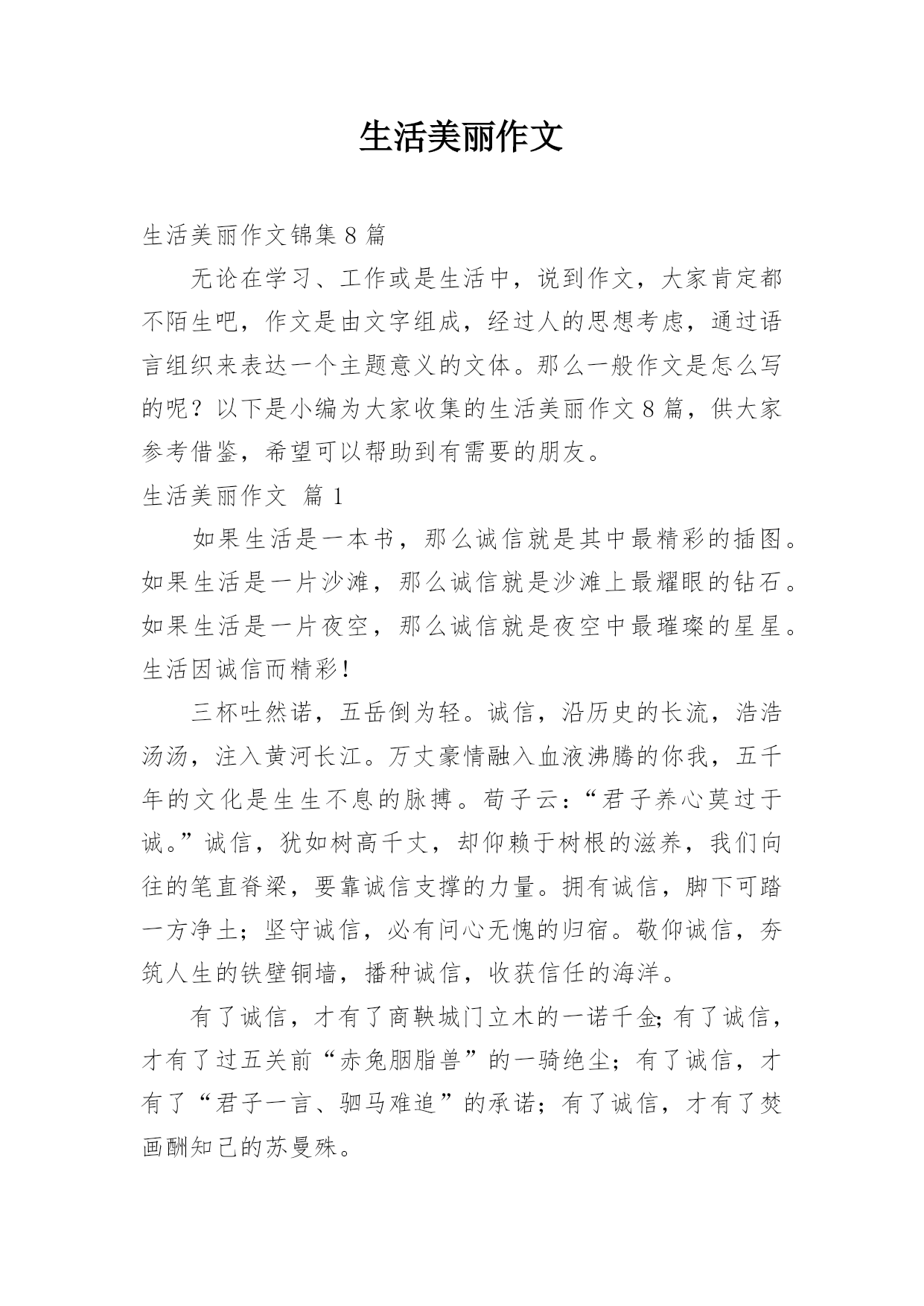 生活美丽作文生活美丽作文锦集8篇无论在学习、工作或是生活中,说到作文,大家肯定都不陌生吧,作文是由文字组成,经过人的思想考虑,通过语言组织来表达一个主题意义的文体。那么一般作文是怎么写的呢?以下是小编为大家收集的生活美丽作文8篇,供大家参考借鉴,希望可以帮助到有需要的朋友。生活美丽作文篇1如果生活是一本书,那么诚信就是其中最精彩的插图。如果生活是一片沙滩,那么诚信就是沙滩上最耀眼的钻石。如果生活是一片夜空,那么诚信就是夜空中最璀璨的星星。生活因诚信而精彩!三杯吐然诺,五岳倒为轻。诚信,沿历史的长流,浩浩汤