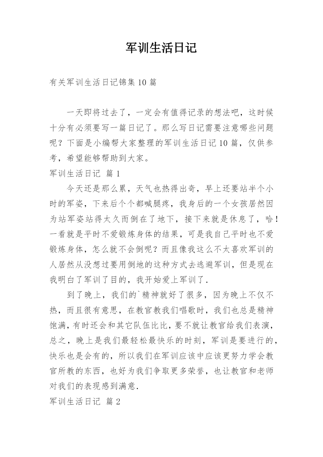 军训生活日记有关军训生活日记锦集10篇一天即将过去了,一定会有值得记录的想法吧,这时候十分有必须要写一篇日记了。那么写日记需要注意哪些问题呢?下面是小编帮大家整理的军训生活日记10篇,仅供参考,希望能够帮助到大家。军训生活日记篇1今天还是那么累,天气也热得出奇,早上还要站半个小时的军姿,下来后个个都喊腿疼,我身后的一个女孩居然因为站军姿站得太久而倒在了地下,接下来就是休息了,哈!一看就是平时不爱锻炼身体的结果,可是我自己平时也不爱锻炼身体,怎么就不会倒呢?而且像我这么不太喜欢军训的人居然从没想过要用倒地的
