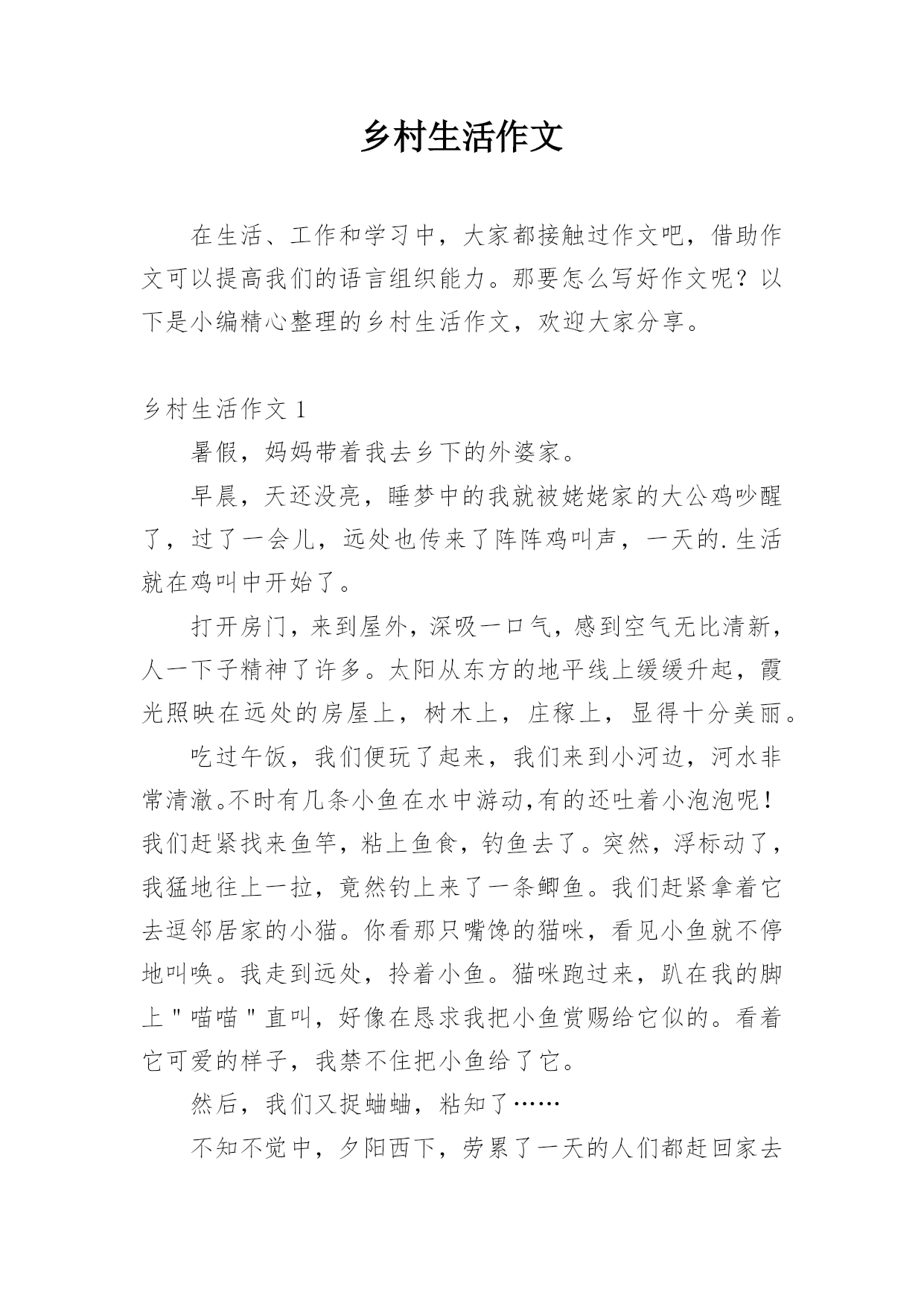 乡村生活作文在生活、工作和学习中,大家都接触过作文吧,借助作文可以提高我们的语言组织能力。那要怎么写好作文呢?以下是小编精心整理的乡村生活作文,欢迎大家分享。乡村生活作文1暑假,妈妈带着我去乡下的外婆家。早晨,天还没亮,睡梦中的我就被姥姥家的大公鸡吵醒了,过了一会儿,远处也传来了阵阵鸡叫声,一天的.生活就在鸡叫中开始了。打开房门,来到屋外,深吸一口气,感到空气无比清新,人一下子精神了许多。太阳从东方的地平线上缓缓升起,霞光照映在远处的房屋上,树木上,庄稼上,显得十分美丽。吃过午饭,我们便玩了起来,我们来到