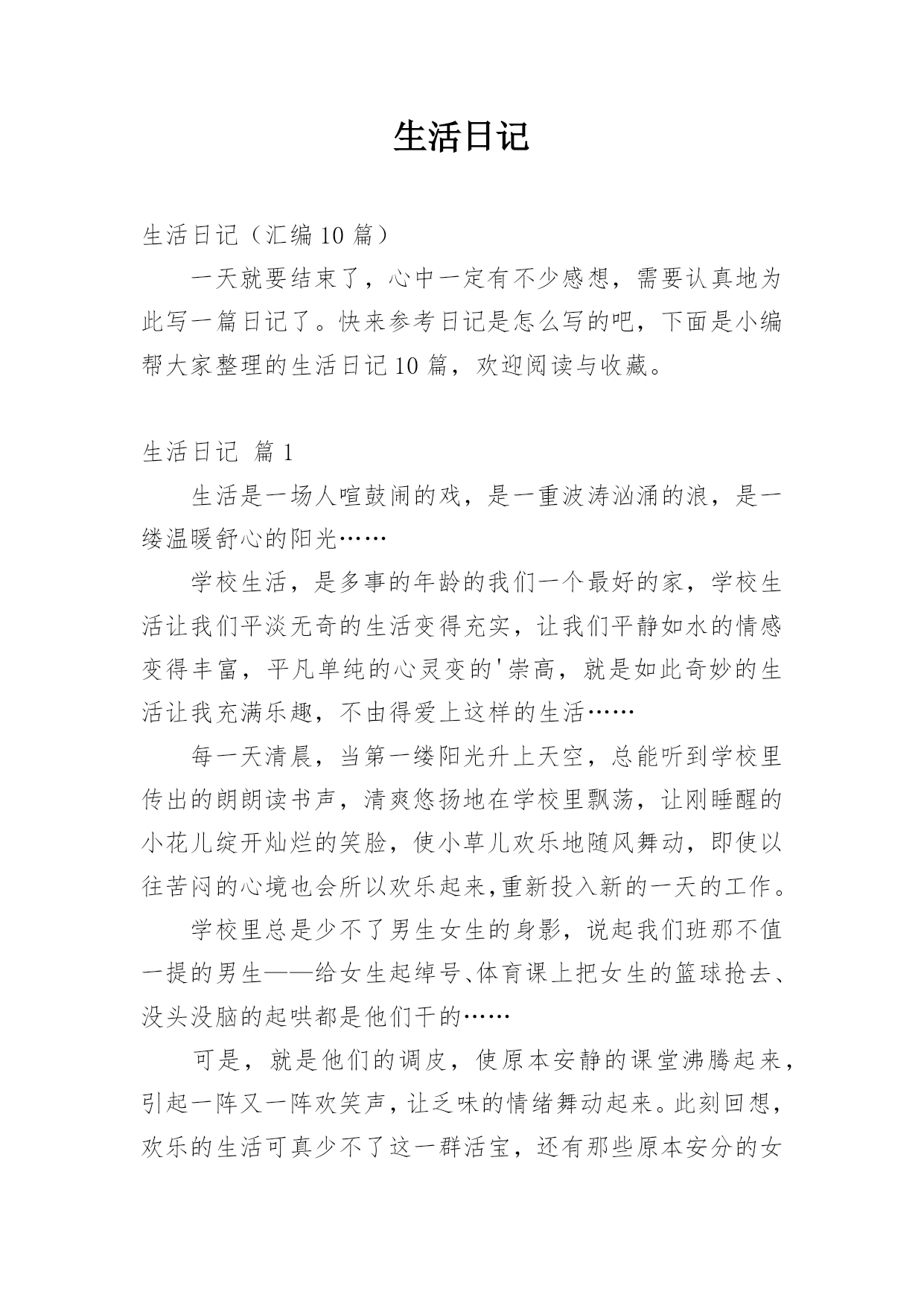 生活日记生活日记(汇编10篇)一天就要结束了,心中一定有不少感想,需要认真地为此写一篇日记了。快来参考日记是怎么写的吧,下面是小编帮大家整理的生活日记10篇,欢迎阅读与收藏。生活日记篇1生活是一场人喧鼓闹的戏,是一重波涛汹涌的浪,是一缕温暖舒心的阳光……学校生活,是多事的年龄的我们一个最好的家,学校生活让我们平淡无奇的生活变得充实,让我们平静如水的情感变得丰富,平凡单纯的心灵变的'崇高,就是如此奇妙的生活让我充满乐趣,不由得爱上这样的生活……每一天清晨,当第一缕阳光升上天空,总能听到学校里传出的朗朗读书声