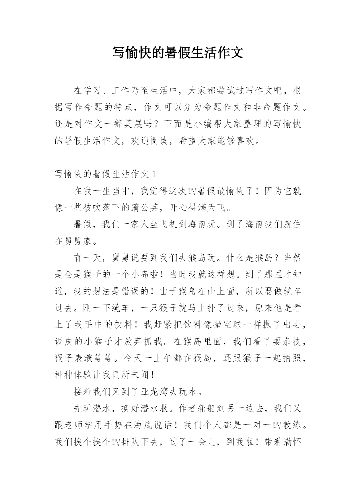 写愉快的暑假生活作文在学习、工作乃至生活中,大家都尝试过写作文吧,根据写作命题的特点,作文可以分为命题作文和非命题作文。还是对作文一筹莫展吗?下面是小编帮大家整理的写愉快的暑假生活作文,欢迎阅读,希望大家能够喜欢。写愉快的暑假生活作文1在我一生当中,我觉得这次的暑假最愉快了!因为它就像一些被吹落下的蒲公英,开心得满天飞。暑假,我们一家人坐飞机到海南玩。到了海南我们就住在舅舅家。有一天,舅舅说要到我们去猴岛玩。什么是猴岛?当然是全是猴子的一个小岛啦!当时我就这样想。到了那里才知道,我的想法是错误的!由于猴岛