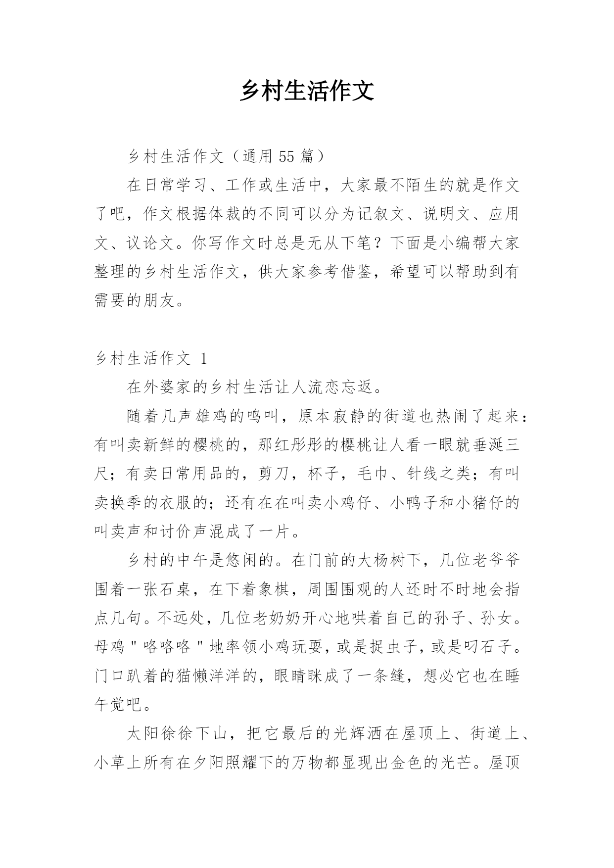 乡村生活作文乡村生活作文(通用55篇)在日常学习、工作或生活中,大家最不陌生的就是作文了吧,作文根据体裁的不同可以分为记叙文、说明文、应用文、议论文。你写作文时总是无从下笔?下面是小编帮大家整理的乡村生活作文,供大家参考借鉴,希望可以帮助到有需要的朋友。乡村生活作文1在外婆家的乡村生活让人流恋忘返。随着几声雄鸡的鸣叫,原本寂静的街道也热闹了起来:有叫卖新鲜的樱桃的,那红彤彤的樱桃让人看一眼就垂涎三尺;有卖日常用品的,剪刀,杯子,毛巾、针线之类;有叫卖换季的衣服的;还有在在叫卖小鸡仔、小鸭子和小猪仔的叫卖声