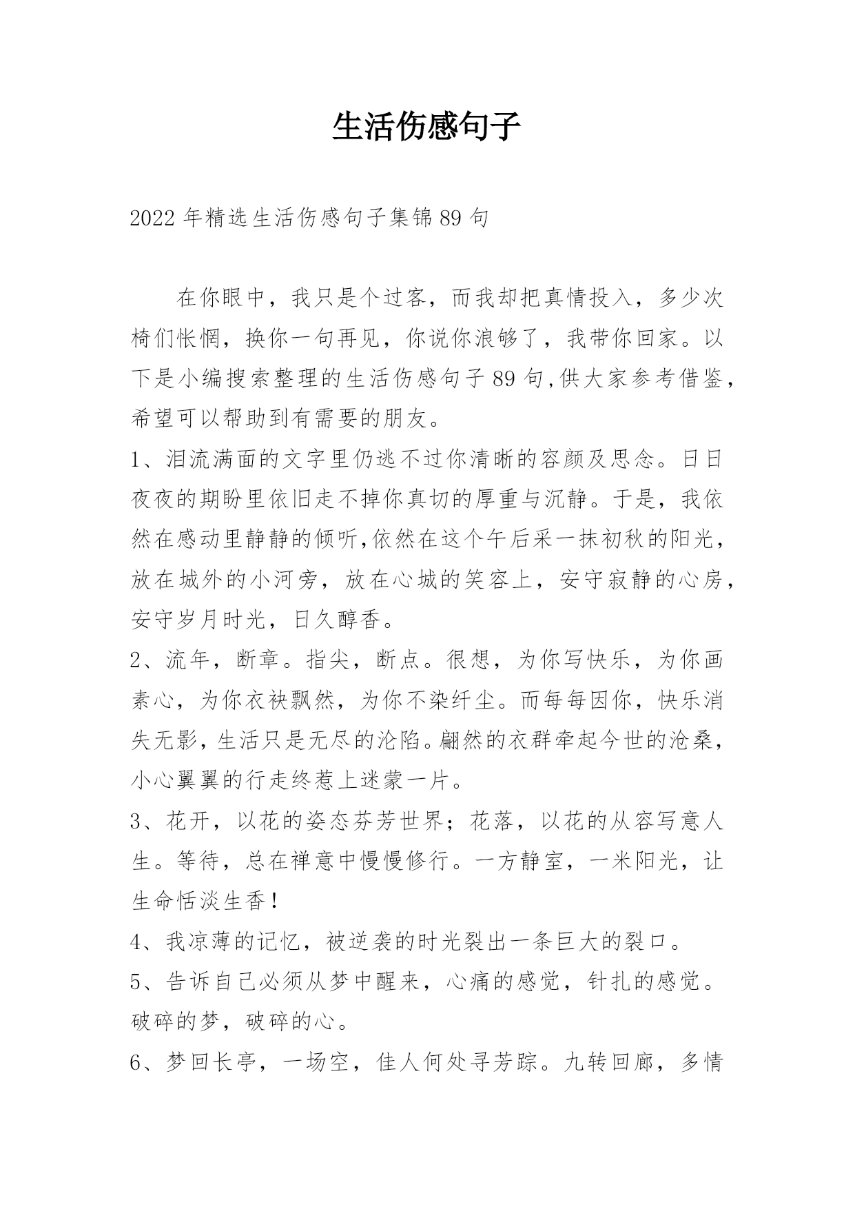 生活伤感句子2022年精选生活伤感句子集锦89句在你眼中,我只是个过客,而我却把真情投入,多少次椅们怅惘,换你一句再见,你说你浪够了,我带你回家。以下是小编搜索整理的生活伤感句子89句,供大家参考借鉴,希望可以帮助到有需要的朋友。1、泪流满面的文字里仍逃不过你清晰的容颜及思念。日日夜夜的期盼里依旧走不掉你真切的厚重与沉静。于是,我依然在感动里静静的倾听,依然在这个午后采一抹初秋的阳光,放在城外的小河旁,放在心城的笑容上,安守寂静的心房,安守岁月时光,日久醇香。2、流年,断章。指尖,断点。很想,为你写快乐,