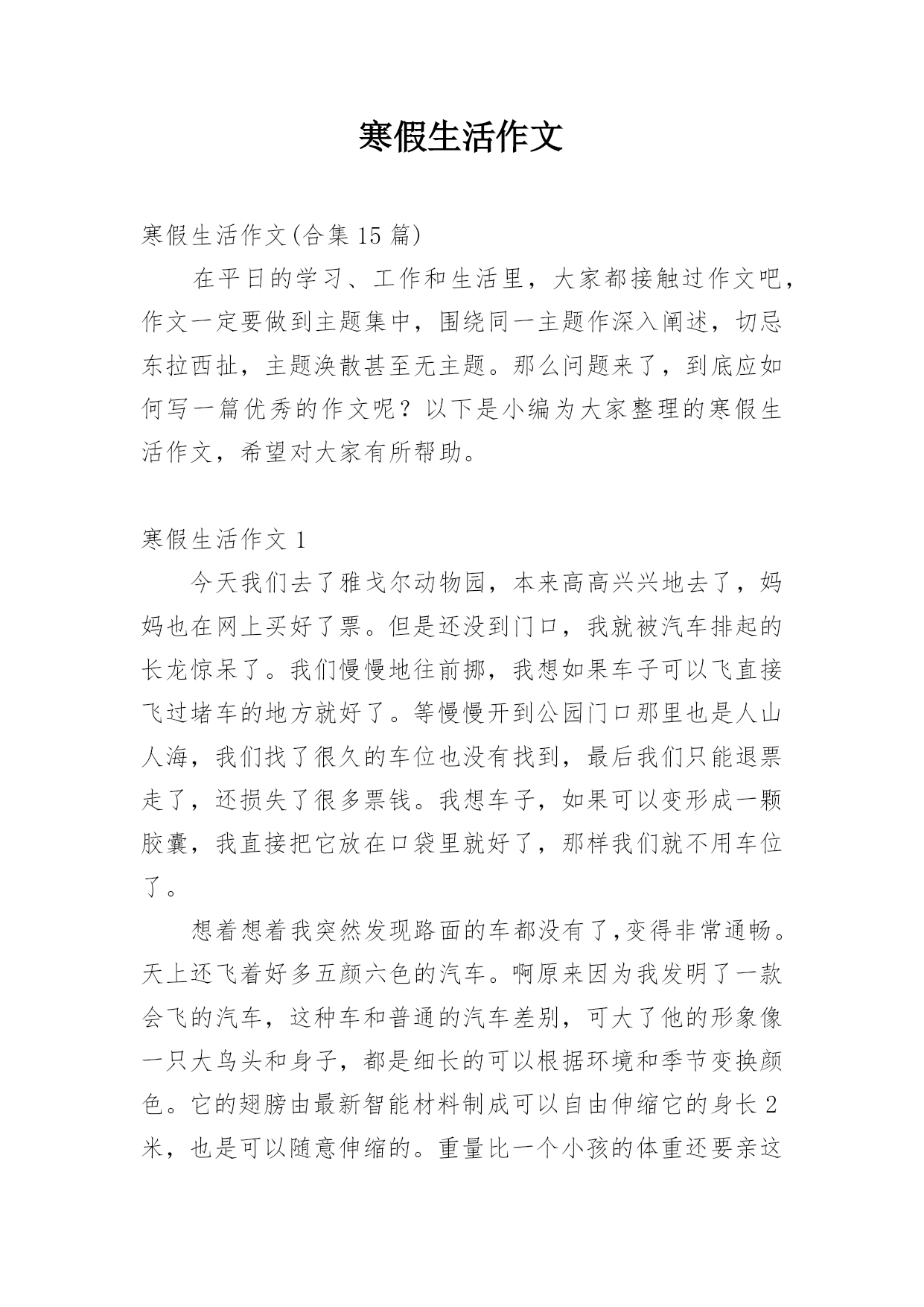 寒假生活作文寒假生活作文(合集15篇)在平日的学习、工作和生活里,大家都接触过作文吧,作文一定要做到主题集中,围绕同一主题作深入阐述,切忌东拉西扯,主题涣散甚至无主题。那么问题来了,到底应如何写一篇优秀的作文呢?以下是小编为大家整理的寒假生活作文,希望对大家有所帮助。寒假生活作文1今天我们去了雅戈尔动物园,本来高高兴兴地去了,妈妈也在网上买好了票。但是还没到门口,我就被汽车排起的长龙惊呆了。我们慢慢地往前挪,我想如果车子可以飞直接飞过堵车的地方就好了。等慢慢开到公园门口那里也是人山人海,我们找了很久的车位