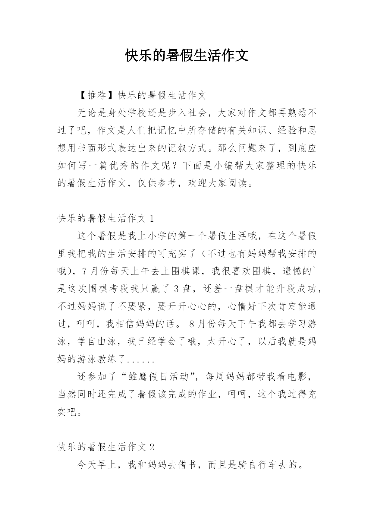 快乐的暑假生活作文【推荐】快乐的暑假生活作文无论是身处学校还是步入社会,大家对作文都再熟悉不过了吧,作文是人们把记忆中所存储的有关知识、经验和思想用书面形式表达出来的记叙方式。那么问题来了,到底应如何写一篇优秀的作文呢?下面是小编帮大家整理的快乐的暑假生活作文,仅供参考,欢迎大家阅读。快乐的暑假生活作文1这个暑假是我上小学的第一个暑假生活哦,在这个暑假里我把我的生活安排的可充实了(不过也有妈妈帮我安排的哦),7月份每天上午去上围棋课,我很喜欢围棋,遗憾的`是这次围棋考段我只赢了3盘,还差一盘棋才能升段成功