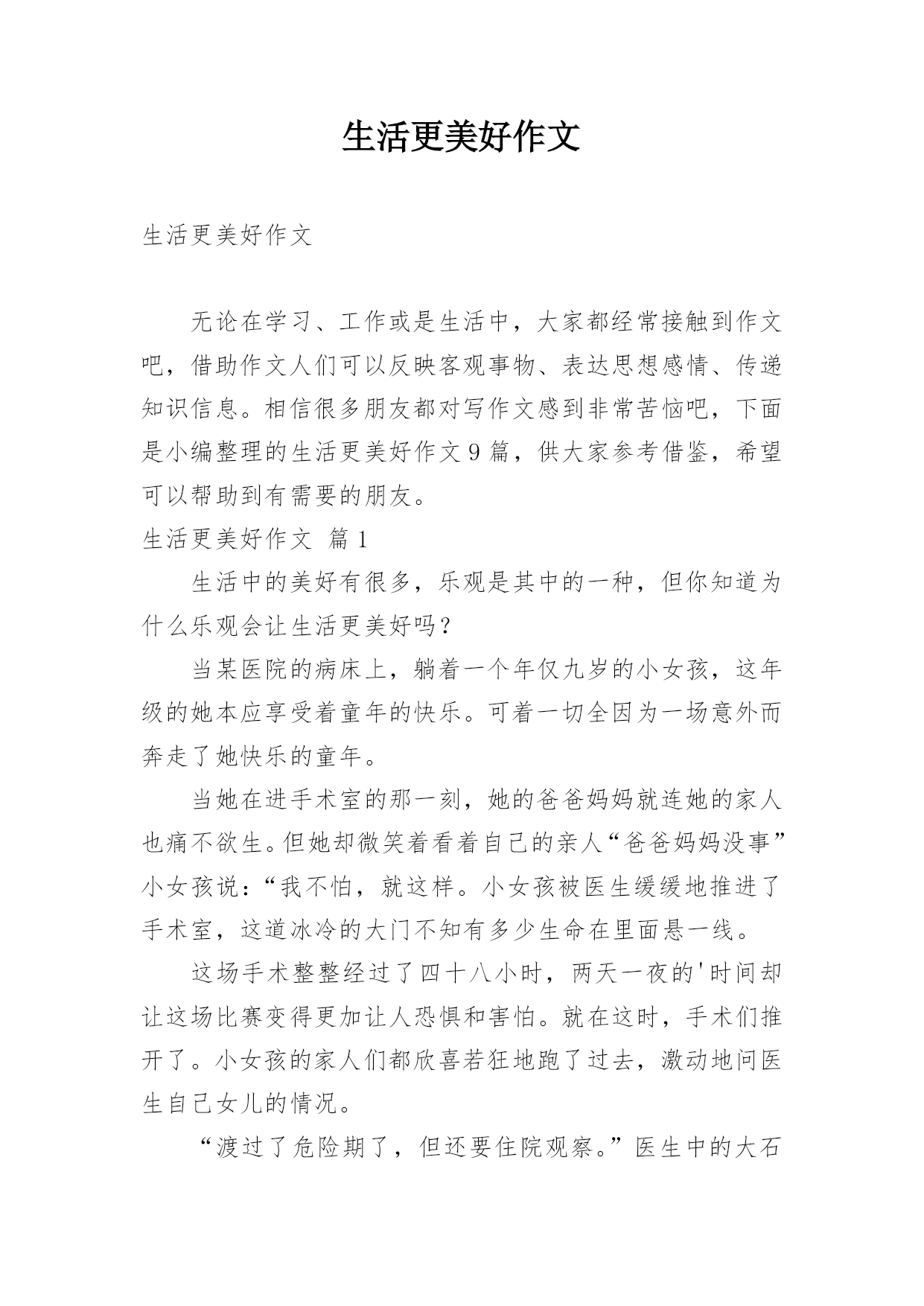 生活更美好作文生活更美好作文无论在学习、工作或是生活中,大家都经常接触到作文吧,借助作文人们可以反映客观事物、表达思想感情、传递知识信息。相信很多朋友都对写作文感到非常苦恼吧,下面是小编整理的生活更美好作文9篇,供大家参考借鉴,希望可以帮助到有需要的朋友。生活更美好作文篇1生活中的美好有很多,乐观是其中的一种,但你知道为什么乐观会让生活更美好吗?当某医院的病床上,躺着一个年仅九岁的小女孩,这年级的她本应享受着童年的快乐。可着一切全因为一场意外而奔走了她快乐的童年。当她在进手术室的那一刻,她的爸爸妈妈就连她