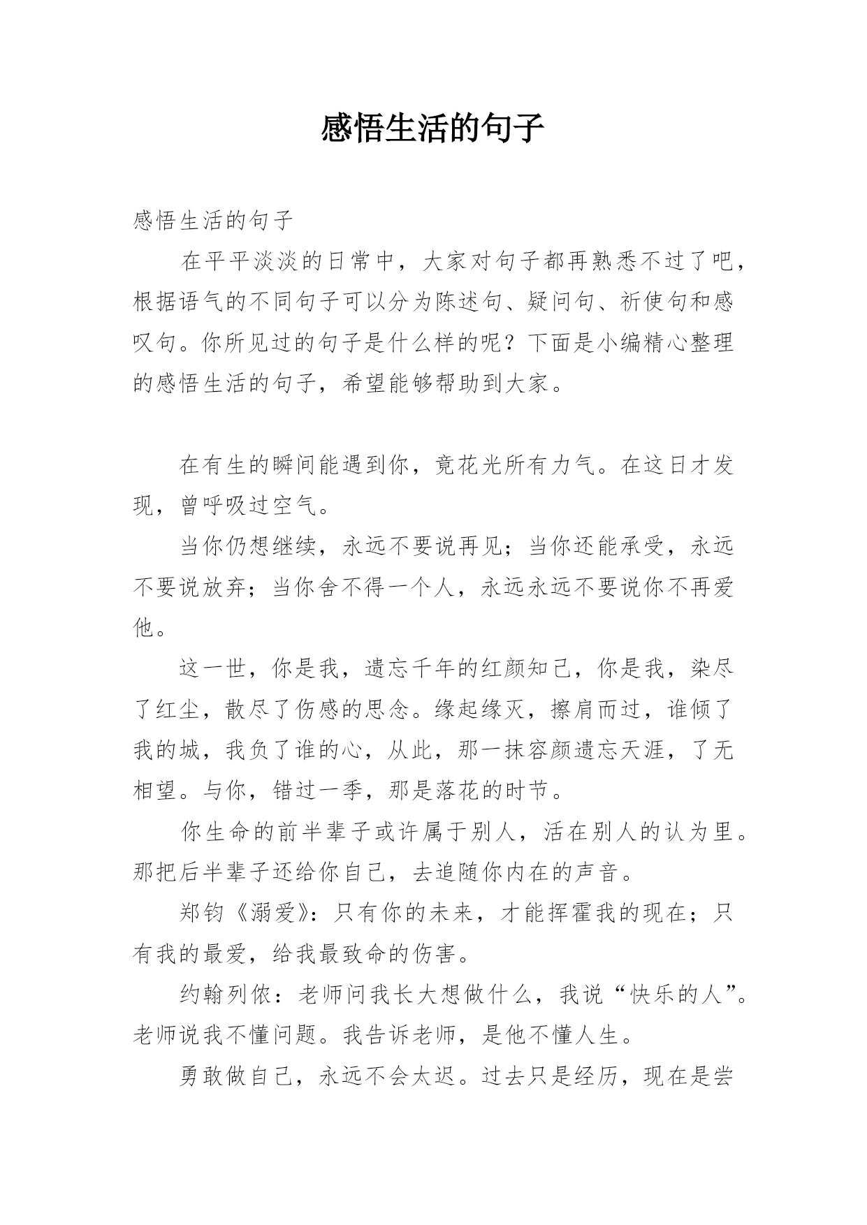 感悟生活的句子感悟生活的句子在平平淡淡的日常中,大家对句子都再熟悉不过了吧,根据语气的不同句子可以分为陈述句、疑问句、祈使句和感叹句。你所见过的句子是什么样的呢?下面是小编精心整理的感悟生活的句子,希望能够帮助到大家。在有生的瞬间能遇到你,竟花光所有力气。在这日才发现,曾呼吸过空气。当你仍想继续,永远不要说再见;当你还能承受,永远不要说放弃;当你舍不得一个人,永远永远不要说你不再爱他。这一世,你是我,遗忘千年的红颜知己,你是我,染尽了红尘,散尽了伤感的思念。缘起缘灭,擦肩而过,谁倾了我的城,我负了谁的心,