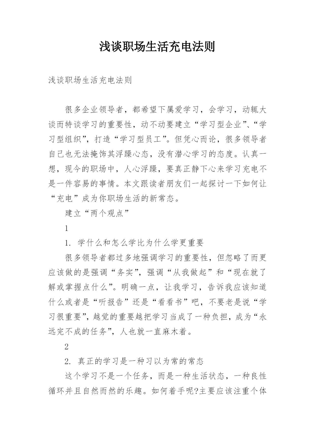 浅谈职场生活充电法则浅谈职场生活充电法则很多企业领导者,都希望下属爱学习,会学习,动辄大谈而特谈学习的重要性,动不动要建立“学习型企业”、“学习型组织”,打造“学习型员工”。但凭心而论,很多领导者自己也无法掩饰其浮躁心态,没有潜心学习的态度。认真一想,现今的职场中,人心浮躁,要真正静下心来学习充电不是一件容易的事情。本文跟读者朋友们一起探讨一下如何让“充电”成为你职场生活的新常态。建立“两个观点”11.学什么和怎么学比为什么学更重要很多领导者都过多地强调学习的重要性,但忽略了而更应该做的是强调“务实”,强