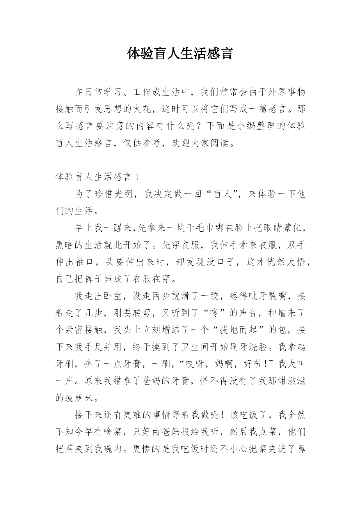 体验盲人生活感言在日常学习、工作或生活中,我们常常会由于外界事物接触而引发思想的火花,这时可以将它们写成一篇感言。那么写感言要注意的内容有什么呢?下面是小编整理的体验盲人生活感言,仅供参考,欢迎大家阅读。体验盲人生活感言1为了珍惜光明,我决定做一回“盲人”,来体验一下他们的生活。早上我一醒来,先拿来一块干毛巾绑在脸上把眼睛蒙住,黑暗的生活就此开始了。先穿衣服,我伸手拿来衣服,双手伸出袖口,头要伸出来时,却发现没口子,这才恍然大悟,自己把裤子当成了衣服在穿。我走出卧室,没走两步就滑了一跤,疼得呲牙裂嘴,接着