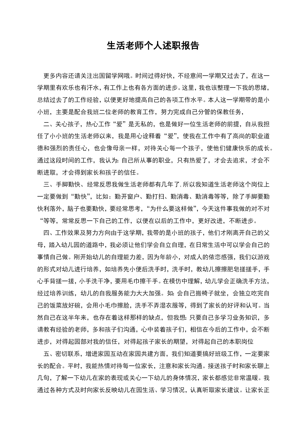 生活老师个人述职报告更多内容还请关注出国留学网哦。时间过得好快,不经意间一学期又过去了,在这一学期里有欢乐也有汗水,有工作上也有各方面的进步。这里,我也该整理一下我的思绪,总结过去了的工作经验,以便更好地提高自己的各项工作水平。本人这一学期带的是小小班,主要是配合我班二位老师的教育工作,努力完成自己分管的保教任务,二、关心孩子,热心工作“爱”是无私的,也是做好一位生活老师的前提,自从我担任了小小班的生活老师以来,我是用心诠释着“爱”,使我在工作中有了高尚的职业道德和强烈的责任心,也会像母亲一样,对待关心每