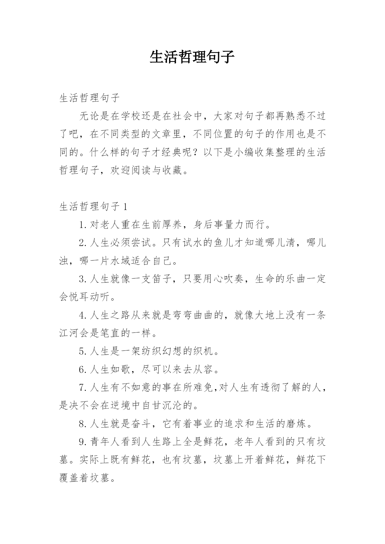 生活哲理句子生活哲理句子无论是在学校还是在社会中,大家对句子都再熟悉不过了吧,在不同类型的文章里,不同位置的句子的作用也是不同的。什么样的句子才经典呢?以下是小编收集整理的生活哲理句子,欢迎阅读与收藏。生活哲理句子11.对老人重在生前厚养,身后事量力而行。2.人生必须尝试。只有试水的鱼儿才知道哪儿清,哪儿浊,哪一片水域适合自己。3.人生就像一支笛子,只要用心吹奏,生命的乐曲一定会悦耳动听。4.人生之路从来就是弯弯曲曲的,就像大地上没有一条江河会是笔直的一样。5.人生是一架纺织幻想的织机。6.人生如歌,尽可