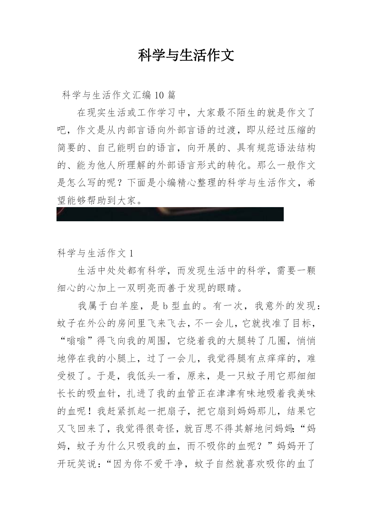 科学与生活作文科学与生活作文汇编10篇在现实生活或工作学习中,大家最不陌生的就是作文了吧,作文是从内部言语向外部言语的过渡,即从经过压缩的简要的、自己能明白的语言,向开展的、具有规范语法结构的、能为他人所理解的外部语言形式的转化。那么一般作文是怎么写的呢?下面是小编精心整理的科学与生活作文,希望能够帮助到大家。科学与生活作文1生活中处处都有科学,而发现生活中的科学,需要一颗细心的心加上一双明亮而善于发现的眼睛。我属于白羊座,是b型血的。有一次,我意外的发现:蚊子在外公的房间里飞来飞去,不一会儿,它就找准了