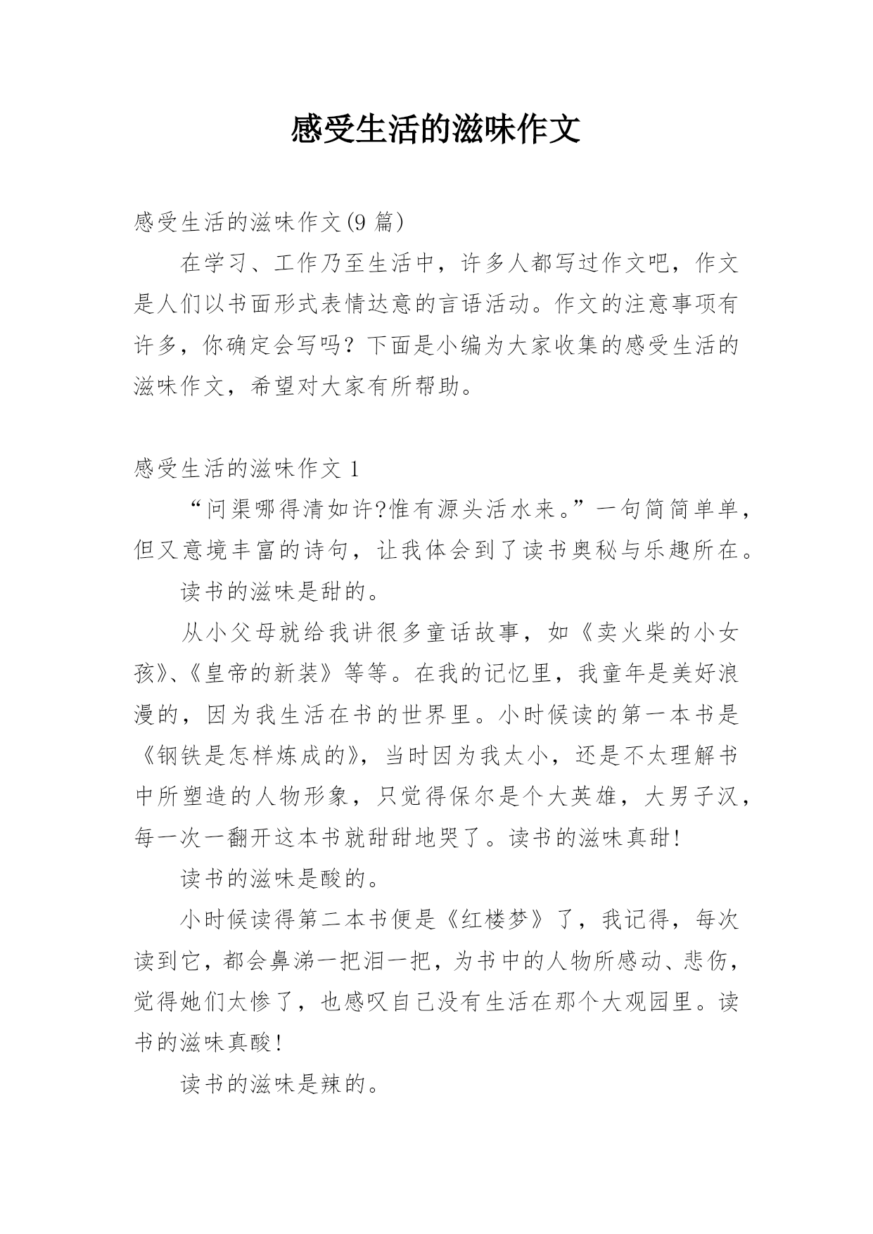 感受生活的滋味作文感受生活的滋味作文(9篇)在学习、工作乃至生活中,许多人都写过作文吧,作文是人们以书面形式表情达意的言语活动。作文的注意事项有许多,你确定会写吗?下面是小编为大家收集的感受生活的滋味作文,希望对大家有所帮助。感受生活的滋味作文1“问渠哪得清如许?惟有源头活水来。”一句简简单单,但又意境丰富的诗句,让我体会到了读书奥秘与乐趣所在。读书的滋味是甜的。从小父母就给我讲很多童话故事,如《卖火柴的小女孩》、《皇帝的新装》等等。在我的记忆里,我童年是美好浪漫的,因为我生活在书的世界里。小时候读的第一