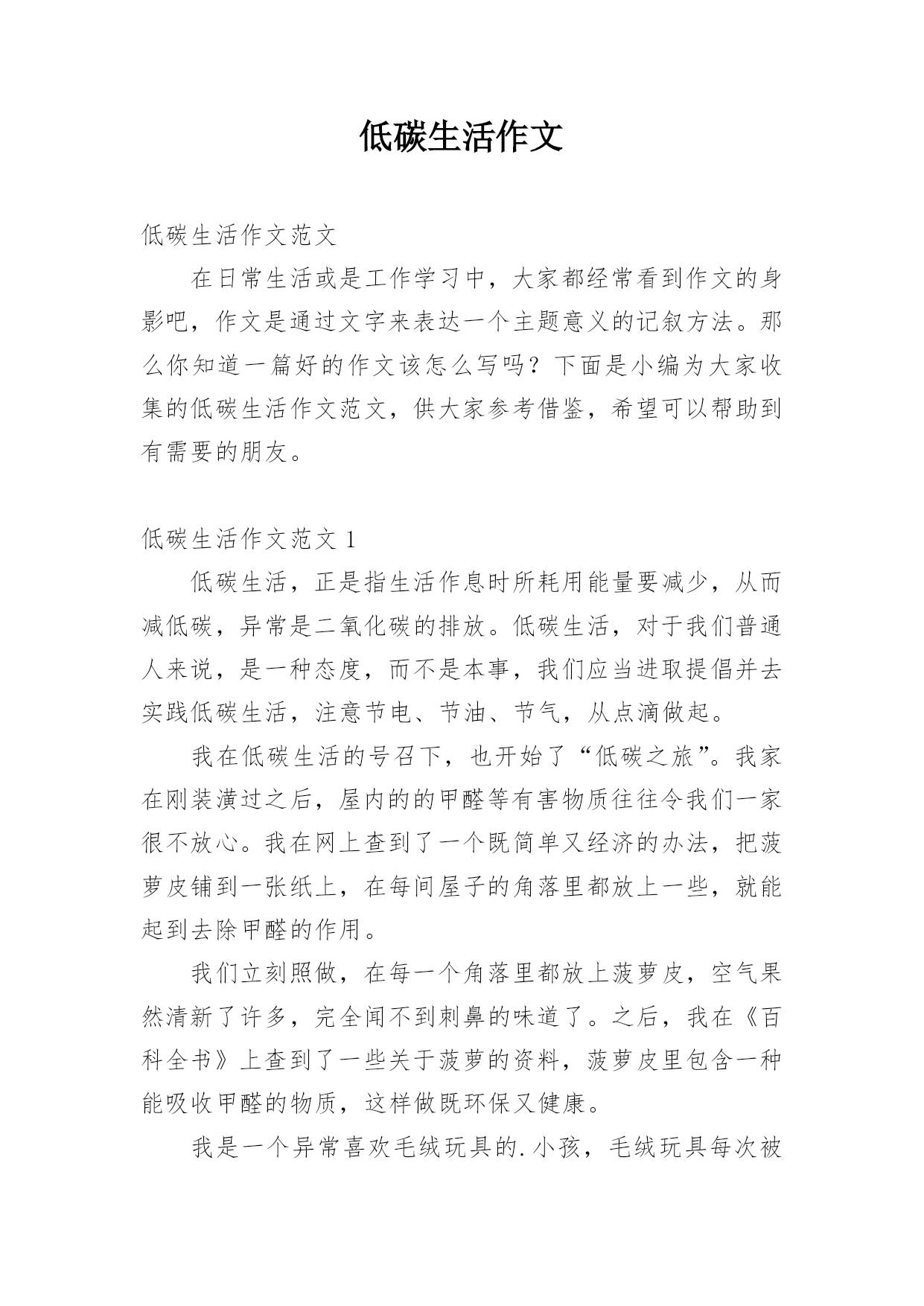 低碳生活作文低碳生活作文范文在日常生活或是工作学习中,大家都经常看到作文的身影吧,作文是通过文字来表达一个主题意义的记叙方法。那么你知道一篇好的作文该怎么写吗?下面是小编为大家收集的低碳生活作文范文,供大家参考借鉴,希望可以帮助到有需要的朋友。低碳生活作文范文1低碳生活,正是指生活作息时所耗用能量要减少,从而减低碳,异常是二氧化碳的排放。低碳生活,对于我们普通人来说,是一种态度,而不是本事,我们应当进取提倡并去实践低碳生活,注意节电、节油、节气,从点滴做起。我在低碳生活的号召下,也开始了“低碳之旅”。我家