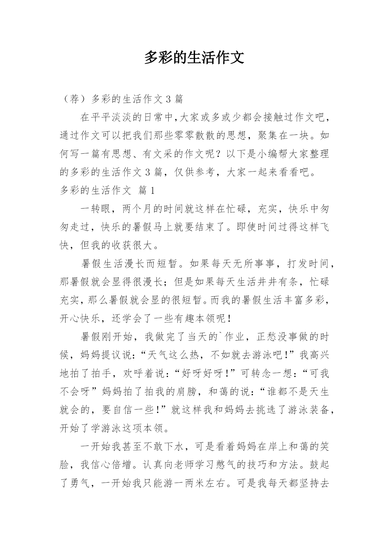 多彩的生活作文(荐)多彩的生活作文3篇在平平淡淡的日常中,大家或多或少都会接触过作文吧,通过作文可以把我们那些零零散散的思想,聚集在一块。如何写一篇有思想、有文采的作文呢?以下是小编帮大家整理的多彩的生活作文3篇,仅供参考,大家一起来看看吧。多彩的生活作文篇1一转眼,两个月的时间就这样在忙碌,充实,快乐中匆匆走过,快乐的暑假马上就要结束了。即使时间过得这样飞快,但我的收获很大。暑假生活漫长而短暂。如果每天无所事事,打发时间,那暑假就会显得很漫长;但是如果每天生活井井有条,忙碌充实,那么暑假就会显的很短暂。