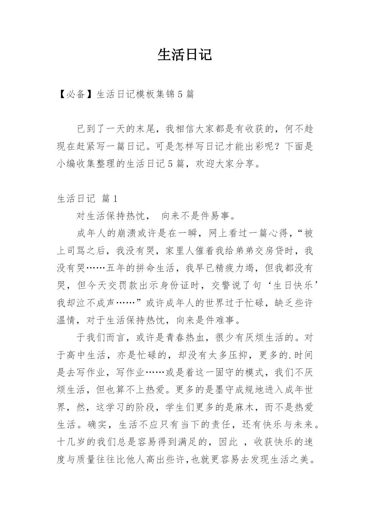 生活日记【必备】生活日记模板集锦5篇已到了一天的末尾,我相信大家都是有收获的,何不趁现在赶紧写一篇日记。可是怎样写日记才能出彩呢?下面是小编收集整理的生活日记5篇,欢迎大家分享。生活日记篇1对生活保持热忱,向来不是件易事。成年人的崩溃或许是在一瞬,网上看过一篇心得,“被上司骂之后,我没有哭,家里人催着我给弟弟交房贷时,我没有哭……五年的拼命生活,我早已精疲力竭,但我都没有哭,但今天交罚款出示身份证时,交警说了句‘生日快乐’我却泣不成声……”或许成年人的世界过于忙碌,缺乏些许温情,对于生活保持热忱,向来是件