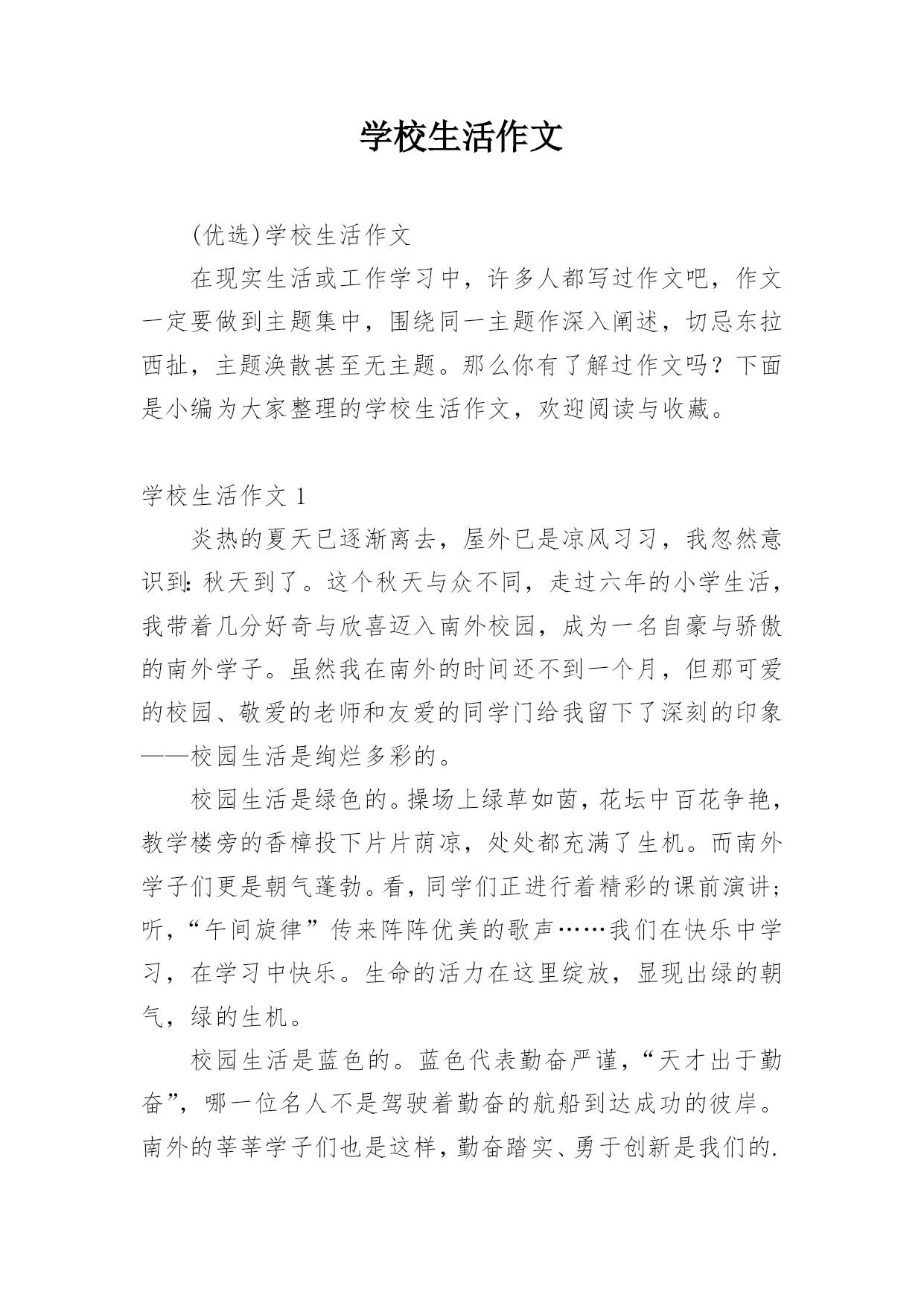 学校生活作文(优选)学校生活作文在现实生活或工作学习中,许多人都写过作文吧,作文一定要做到主题集中,围绕同一主题作深入阐述,切忌东拉西扯,主题涣散甚至无主题。那么你有了解过作文吗?下面是小编为大家整理的学校生活作文,欢迎阅读与收藏。学校生活作文1炎热的夏天已逐渐离去,屋外已是凉风习习,我忽然意识到:秋天到了。这个秋天与众不同,走过六年的小学生活,我带着几分好奇与欣喜迈入南外校园,成为一名自豪与骄傲的南外学子。虽然我在南外的时间还不到一个月,但那可爱的校园、敬爱的老师和友爱的同学门给我留下了深刻的印象——校