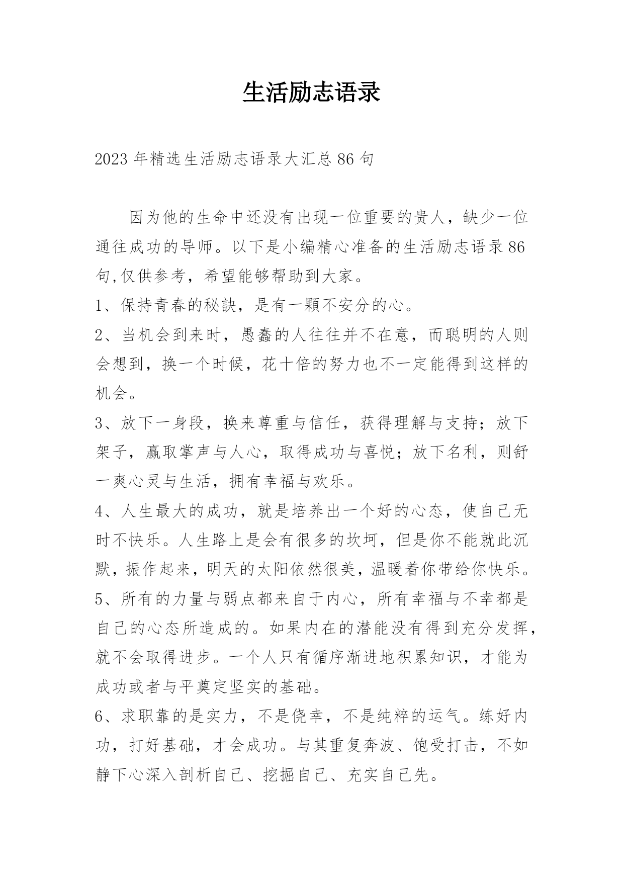 生活励志语录2023年精选生活励志语录大汇总86句因为他的生命中还没有出现一位重要的贵人,缺少一位通往成功的导师。以下是小编精心准备的生活励志语录86句,仅供参考,希望能够帮助到大家。1、保持青春的秘訣,是有一顆不安分的心。2、当机会到来时,愚蠢的人往往并不在意,而聪明的人则会想到,换一个时候,花十倍的努力也不一定能得到这样的机会。3、放下一身段,换来尊重与信任,获得理解与支持;放下架子,赢取掌声与人心,取得成功与喜悦;放下名利,则舒一爽心灵与生活,拥有幸福与欢乐。4、人生最大的成功,就是培养出一个好的心