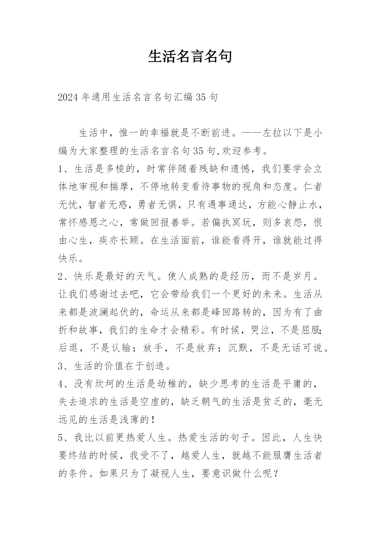 生活名言名句2024年通用生活名言名句汇编35句生活中,惟一的幸福就是不断前进。——左拉以下是小编为大家整理的生活名言名句35句,欢迎参考。1、生活是多棱的,时常伴随着残缺和遗憾,我们要学会立体地审视和揣摩,不停地转变看待事物的视角和态度。仁者无忧,智者无惑,勇者无惧,只有遇事通达,方能心静止水,常怀感恩之心,常做回报善举。若偏执冥玩,则多哀怨,恨由心生,疾亦长顾。在生活面前,谁能看得开,谁就能过得快乐。2、快乐是最好的天气。使人成熟的是经历,而不是岁月。让我们感谢过去吧,它会带给我们一个更好的未来。生活