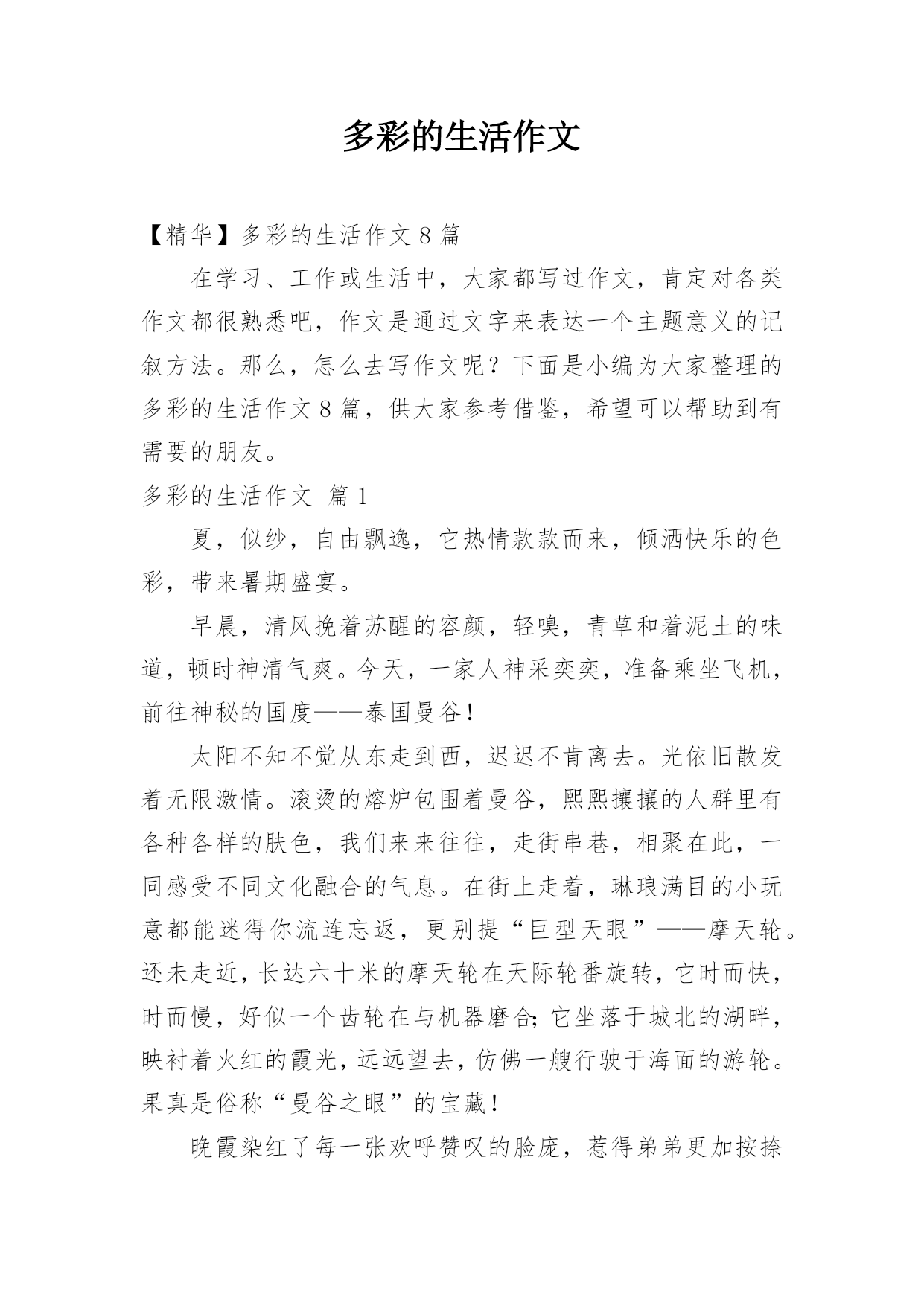 多彩的生活作文【精华】多彩的生活作文8篇在学习、工作或生活中,大家都写过作文,肯定对各类作文都很熟悉吧,作文是通过文字来表达一个主题意义的记叙方法。那么,怎么去写作文呢?下面是小编为大家整理的多彩的生活作文8篇,供大家参考借鉴,希望可以帮助到有需要的朋友。多彩的生活作文篇1夏,似纱,自由飘逸,它热情款款而来,倾洒快乐的色彩,带来暑期盛宴。早晨,清风挽着苏醒的容颜,轻嗅,青草和着泥土的味道,顿时神清气爽。今天,一家人神采奕奕,准备乘坐飞机,前往神秘的国度——泰国曼谷!太阳不知不觉从东走到西,迟迟不肯离去。光