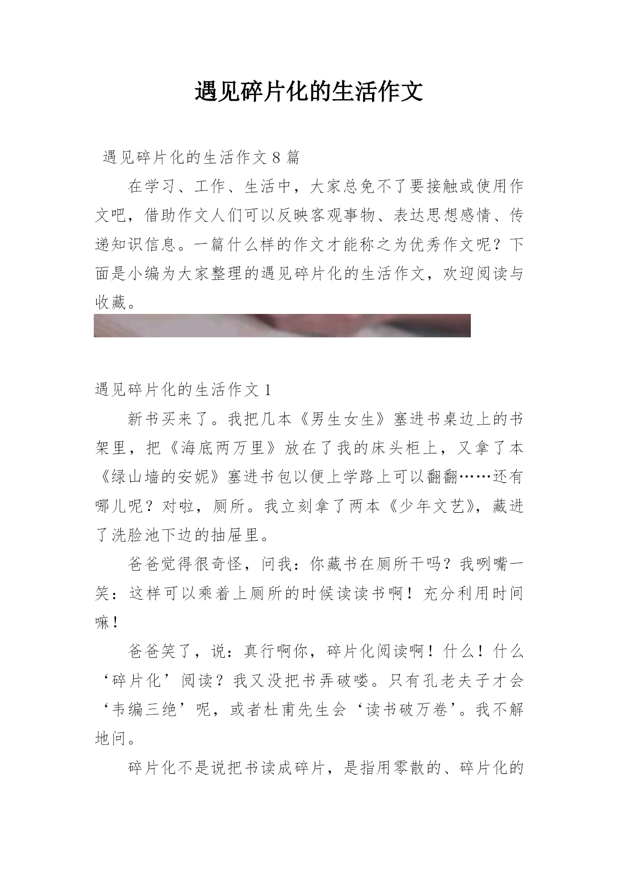遇见碎片化的生活作文遇见碎片化的生活作文8篇在学习、工作、生活中,大家总免不了要接触或使用作文吧,借助作文人们可以反映客观事物、表达思想感情、传递知识信息。一篇什么样的作文才能称之为优秀作文呢?下面是小编为大家整理的遇见碎片化的生活作文,欢迎阅读与收藏。遇见碎片化的生活作文1新书买来了。我把几本《男生女生》塞进书桌边上的书架里,把《海底两万里》放在了我的床头柜上,又拿了本《绿山墙的安妮》塞进书包以便上学路上可以翻翻……还有哪儿呢?对啦,厕所。我立刻拿了两本《少年文艺》,藏进了洗脸池下边的抽屉里。爸爸觉得很