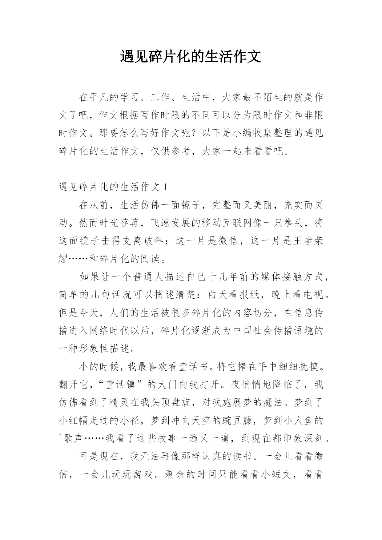 遇见碎片化的生活作文在平凡的学习、工作、生活中,大家最不陌生的就是作文了吧,作文根据写作时限的不同可以分为限时作文和非限时作文。那要怎么写好作文呢?以下是小编收集整理的遇见碎片化的生活作文,仅供参考,大家一起来看看吧。遇见碎片化的生活作文1在从前,生活仿佛一面镜子,完整而又美丽,充实而灵动。然而时光荏苒,飞速发展的移动互联网像一只拳头,将这面镜子击得支离破碎:这一片是微信,这一片是王者荣耀……和碎片化的阅读。如果让一个普通人描述自己十几年前的媒体接触方式,简单的几句话就可以描述清楚:白天看报纸,晚上看电视