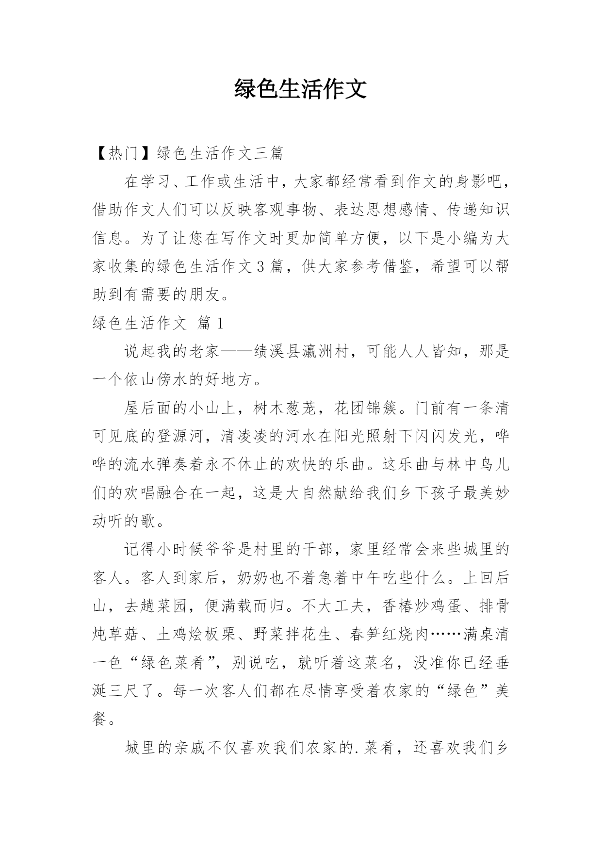 绿色生活作文【热门】绿色生活作文三篇在学习、工作或生活中,大家都经常看到作文的身影吧,借助作文人们可以反映客观事物、表达思想感情、传递知识信息。为了让您在写作文时更加简单方便,以下是小编为大家收集的绿色生活作文3篇,供大家参考借鉴,希望可以帮助到有需要的朋友。绿色生活作文篇1说起我的老家——绩溪县瀛洲村,可能人人皆知,那是一个依山傍水的好地方。屋后面的小山上,树木葱茏,花团锦簇。门前有一条清可见底的登源河,清凌凌的河水在阳光照射下闪闪发光,哗哗的流水弹奏着永不休止的欢快的乐曲。这乐曲与林中鸟儿们的欢唱融合