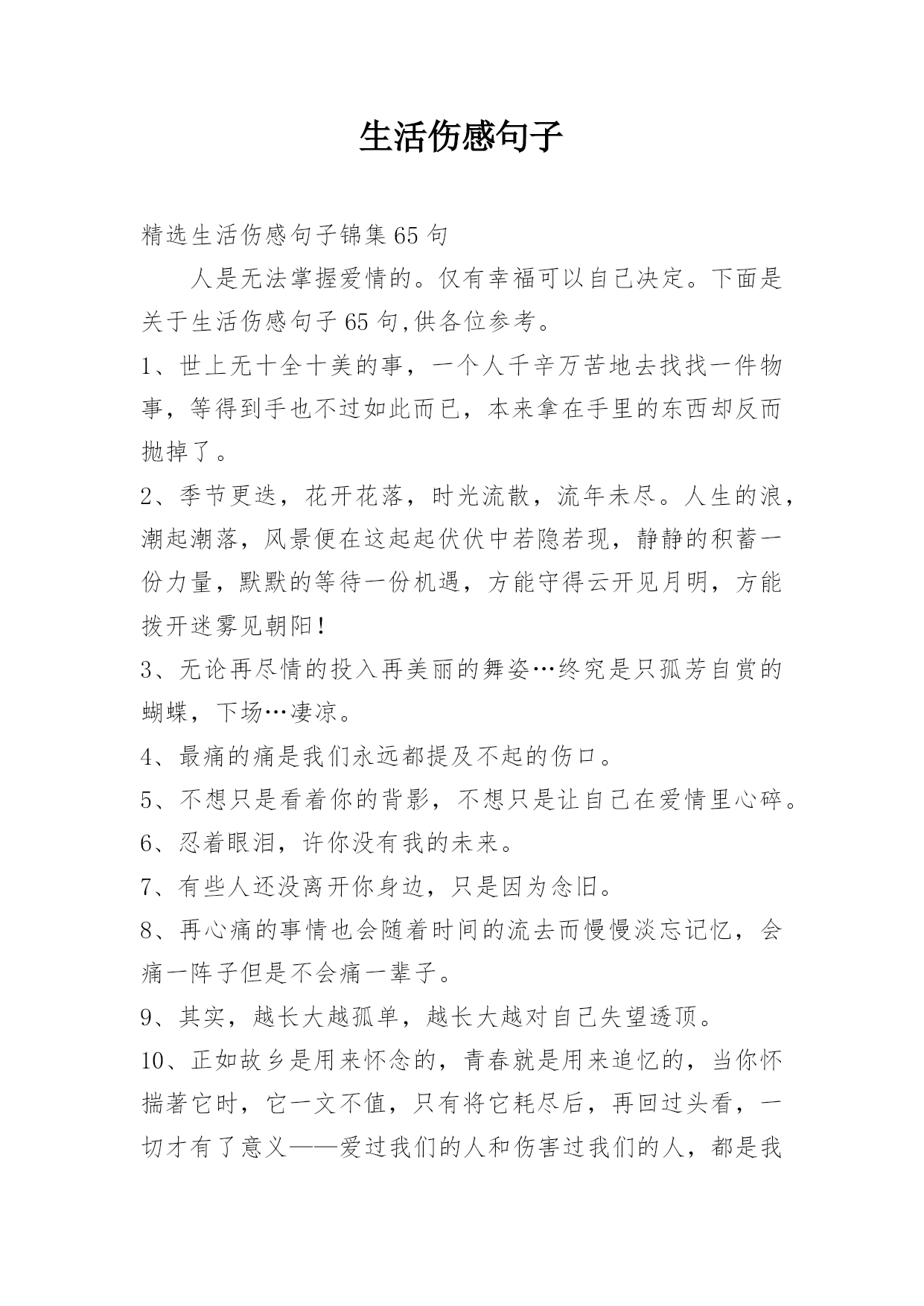 生活伤感句子精选生活伤感句子锦集65句人是无法掌握爱情的。仅有幸福可以自己决定。下面是关于生活伤感句子65句,供各位参考。1、世上无十全十美的事,一个人千辛万苦地去找找一件物事,等得到手也不过如此而已,本来拿在手里的东西却反而抛掉了。2、季节更迭,花开花落,时光流散,流年未尽。人生的浪,潮起潮落,风景便在这起起伏伏中若隐若现,静静的积蓄一份力量,默默的等待一份机遇,方能守得云开见月明,方能拨开迷雾见朝阳!3、无论再尽情的投入再美丽的舞姿…终究是只孤芳自赏的蝴蝶,下场…凄凉。4、最痛的痛是我们永远都提及不起