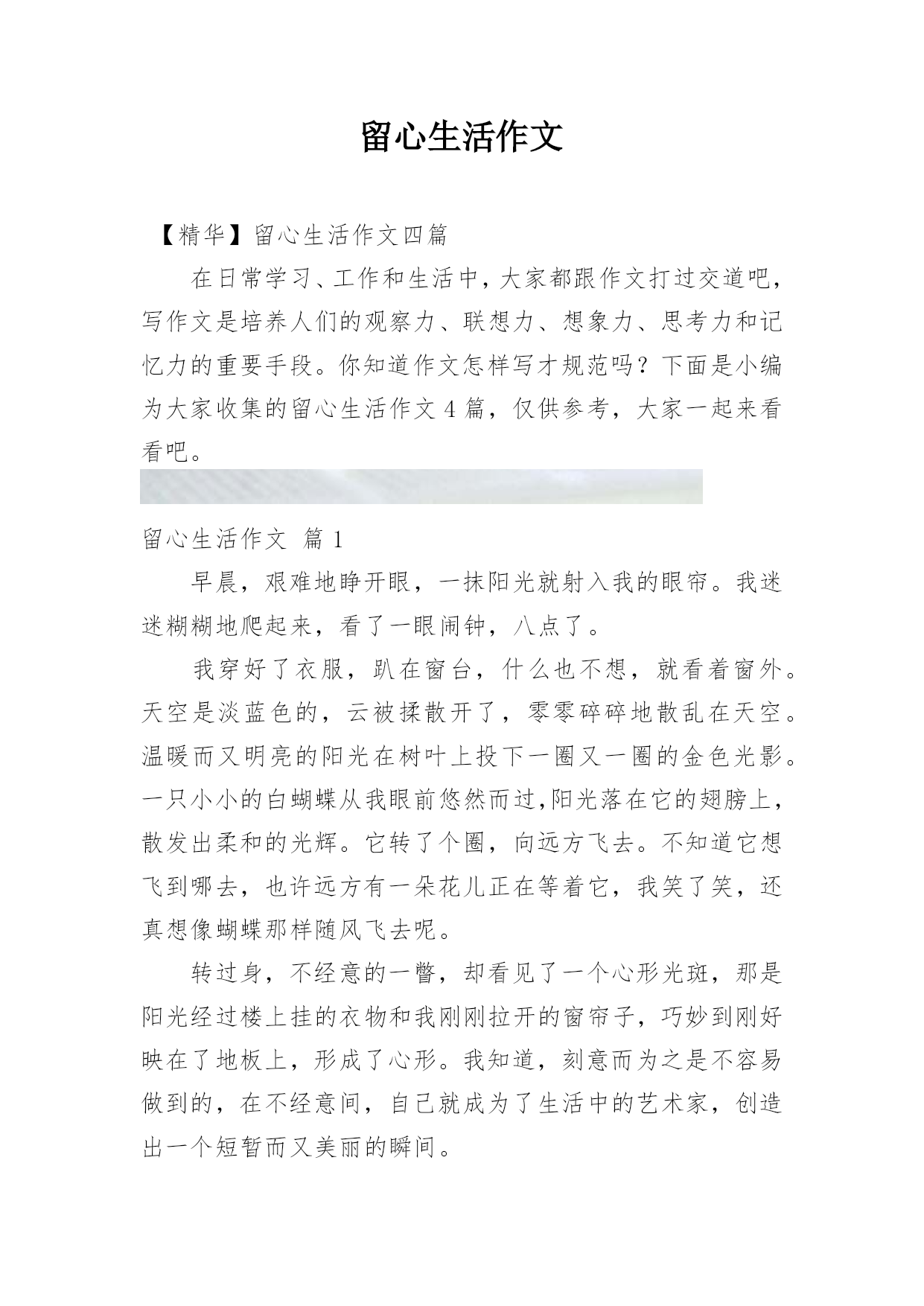 留心生活作文【精华】留心生活作文四篇在日常学习、工作和生活中,大家都跟作文打过交道吧,写作文是培养人们的观察力、联想力、想象力、思考力和记忆力的重要手段。你知道作文怎样写才规范吗?下面是小编为大家收集的留心生活作文4篇,仅供参考,大家一起来看看吧。留心生活作文篇1早晨,艰难地睁开眼,一抹阳光就射入我的眼帘。我迷迷糊糊地爬起来,看了一眼闹钟,八点了。我穿好了衣服,趴在窗台,什么也不想,就看着窗外。天空是淡蓝色的,云被揉散开了,零零碎碎地散乱在天空。温暖而又明亮的阳光在树叶上投下一圈又一圈的金色光影。一只小小