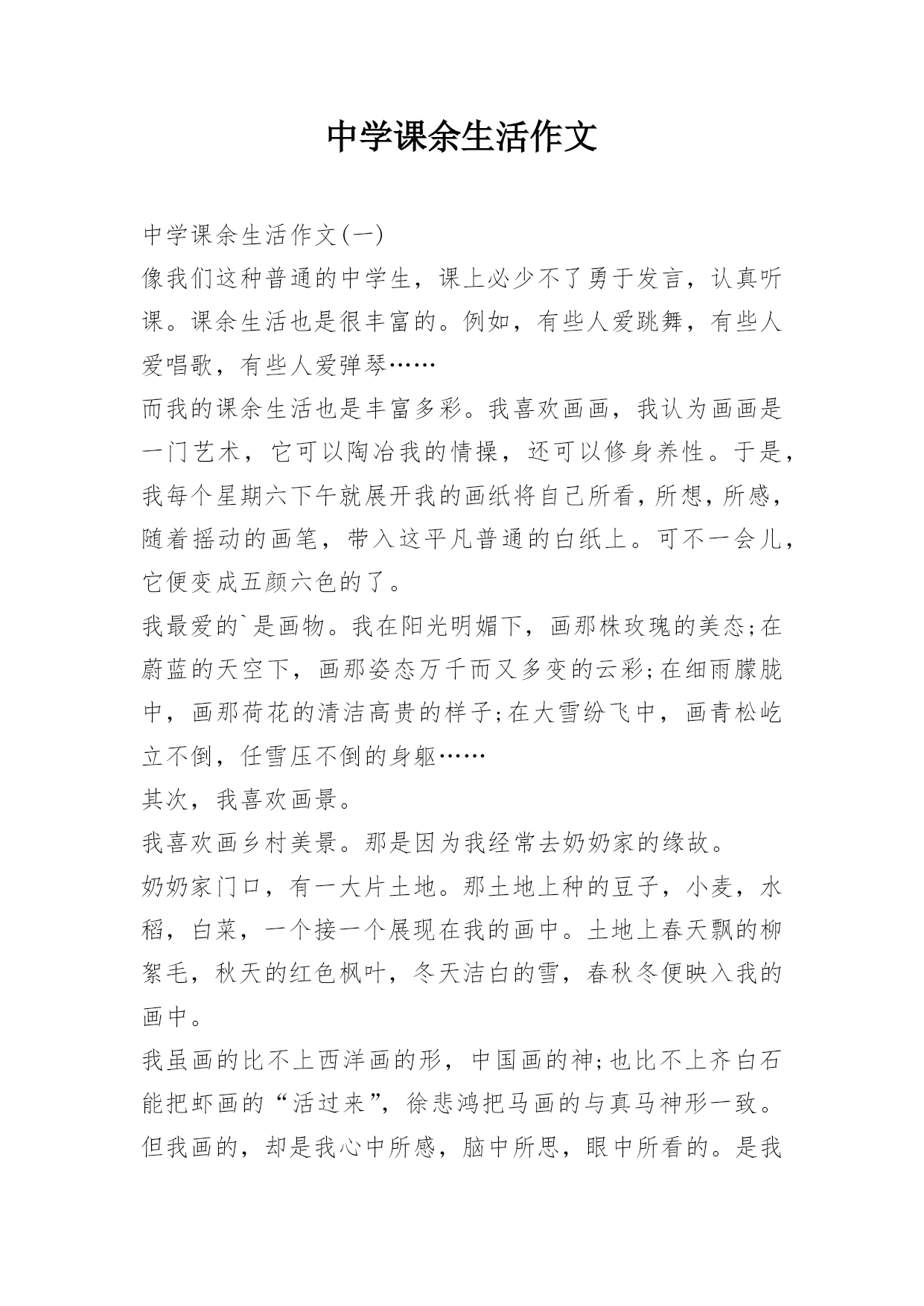 中学课余生活作文中学课余生活作文(一)像我们这种普通的中学生,课上必少不了勇于发言,认真听课。课余生活也是很丰富的。例如,有些人爱跳舞,有些人爱唱歌,有些人爱弹琴……而我的课余生活也是丰富多彩。我喜欢画画,我认为画画是一门艺术,它可以陶冶我的情操,还可以修身养性。于是,我每个星期六下午就展开我的画纸将自己所看,所想,所感,随着摇动的画笔,带入这平凡普通的白纸上。可不一会儿,它便变成五颜六色的了。我最爱的`是画物。我在阳光明媚下,画那株玫瑰的美态;在蔚蓝的天空下,画那姿态万千而又多变的云彩;在细雨朦胧中,画