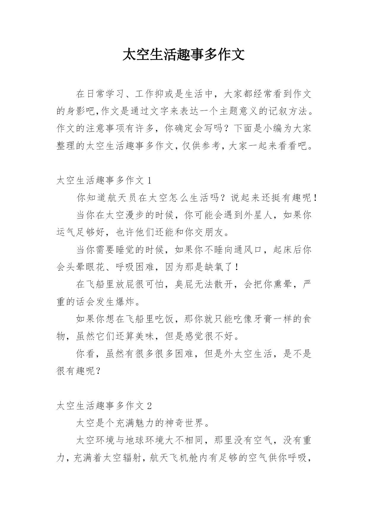太空生活趣事多作文在日常学习、工作抑或是生活中,大家都经常看到作文的身影吧,作文是通过文字来表达一个主题意义的记叙方法。作文的注意事项有许多,你确定会写吗?下面是小编为大家整理的太空生活趣事多作文,仅供参考,大家一起来看看吧。太空生活趣事多作文1你知道航天员在太空怎么生活吗?说起来还挺有趣呢!当你在太空漫步的时候,你可能会遇到外星人,如果你运气足够好,也许他们还能和你交朋友。当你需要睡觉的时候,如果你不睡向通风口,起床后你会头晕眼花、呼吸困难,因为那是缺氧了!在飞船里放屁很可怕,臭屁无法散开,会把你熏晕,