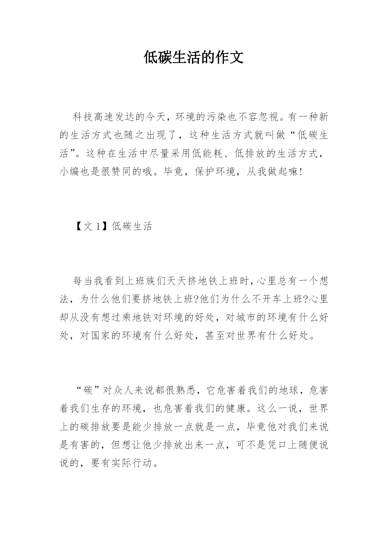 低碳生活的作文科技高速发达的今天,环境的污染也不容忽视。有一种新的生活方式也随之出现了,这种生活方式就叫做“低碳生活”。这种在生活中尽量采用低能耗、低排放的生活方式,小编也是很赞同的哦。毕竟,保护环境,从我做起嘛!【文1】低碳生活每当我看到上班族们天天挤地铁上班时,心里总有一个想法,为什么他们要挤地铁上班?他们为什么不开车上班?心里却从没有想过乘地铁对环境的好处,对城市的环境有什么好处,对国家的环境有什么好处,甚至对世界有什么好处。“碳”对众人来说都很熟悉,它危害着我们的地球,危害着我们生存的环境,也危害