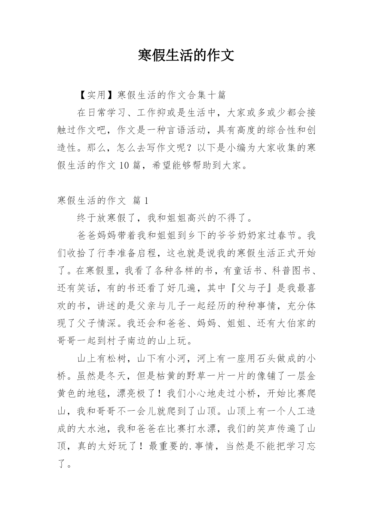 寒假生活的作文【实用】寒假生活的作文合集十篇在日常学习、工作抑或是生活中,大家或多或少都会接触过作文吧,作文是一种言语活动,具有高度的综合性和创造性。那么,怎么去写作文呢?以下是小编为大家收集的寒假生活的作文10篇,希望能够帮助到大家。寒假生活的作文篇1终于放寒假了,我和姐姐高兴的不得了。爸爸妈妈带着我和姐姐到乡下的爷爷奶奶家过春节。我们收拾了行李准备启程,这也就是说我的寒假生活正式开始了。在寒假里,我看了各种各样的书,有童话书、科普图书、还有笑话,有的书还看了好几遍,其中『父与子』是我最喜欢的书,讲述的